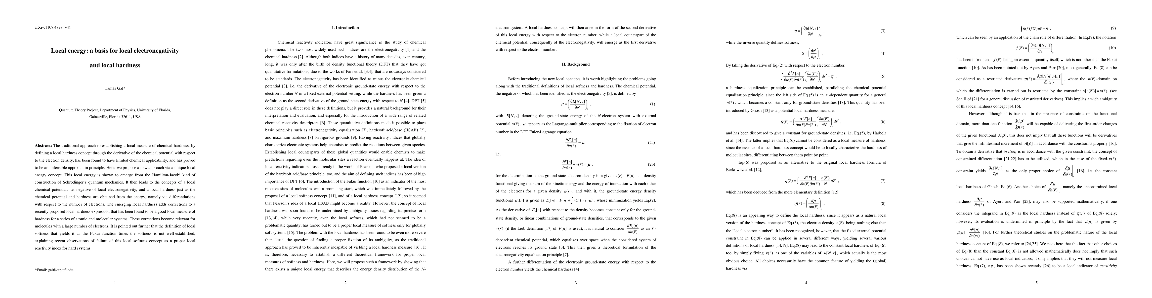 This paper proposes a new local energy concept to define local chemical hardness and electronegativity, emerging from a Hamilton-Jacobi construction in quantum mechanics. It corrects previous local hardness measures, especially for large electron systems, and critiques the established local softness definition.