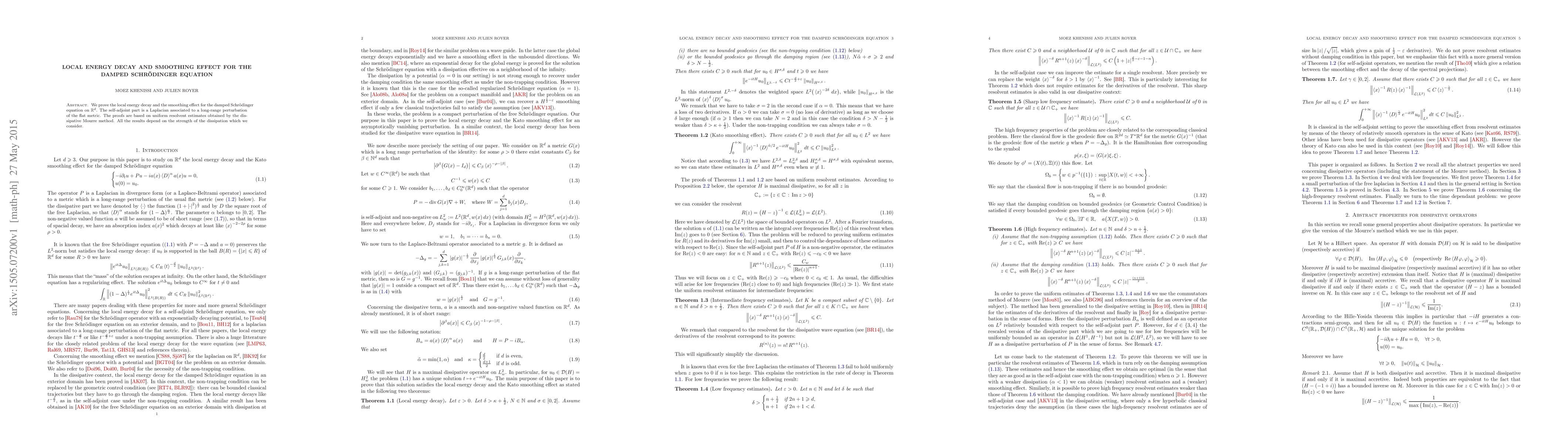 This paper proves local energy decay and smoothing effect for the damped Schrödinger equation on \( \mathbb{R}^d \), where the self-adjoint part is a Laplacian influenced by a long-range perturbation. The proofs rely on uniform resolvent estimates derived using the dissipative Mourre method, with results contingent on the dissipation strength.