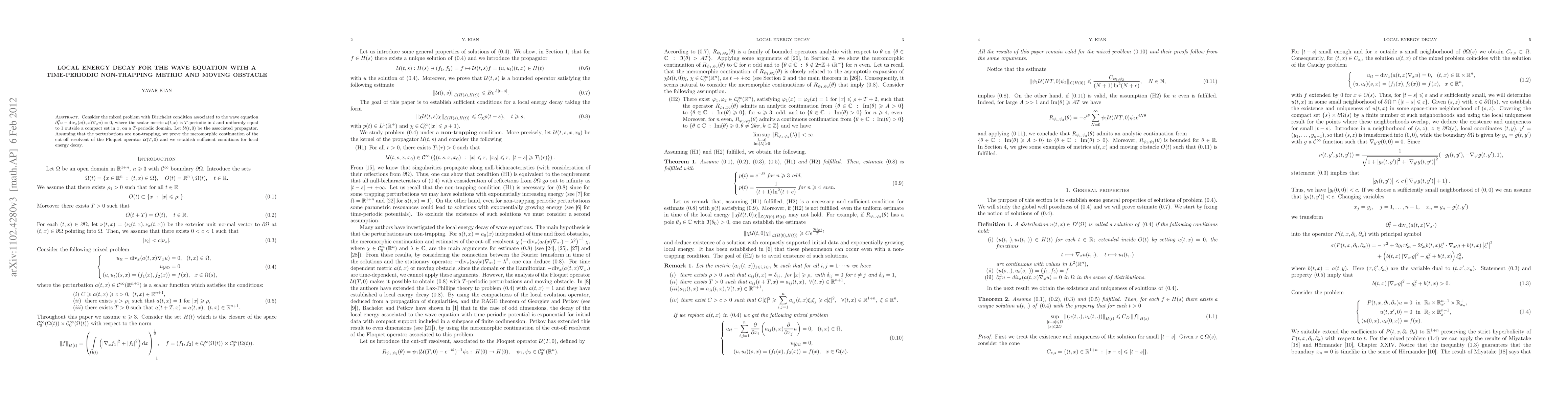 This paper investigates the wave equation with a time-periodic non-trapping metric and a moving obstacle, proving the meromorphic continuation of the cut-off resolvent of the Floquet operator and establishing conditions for local energy decay. The study focuses on the mixed problem with Dirichlet boundary conditions in a periodically varying domain.