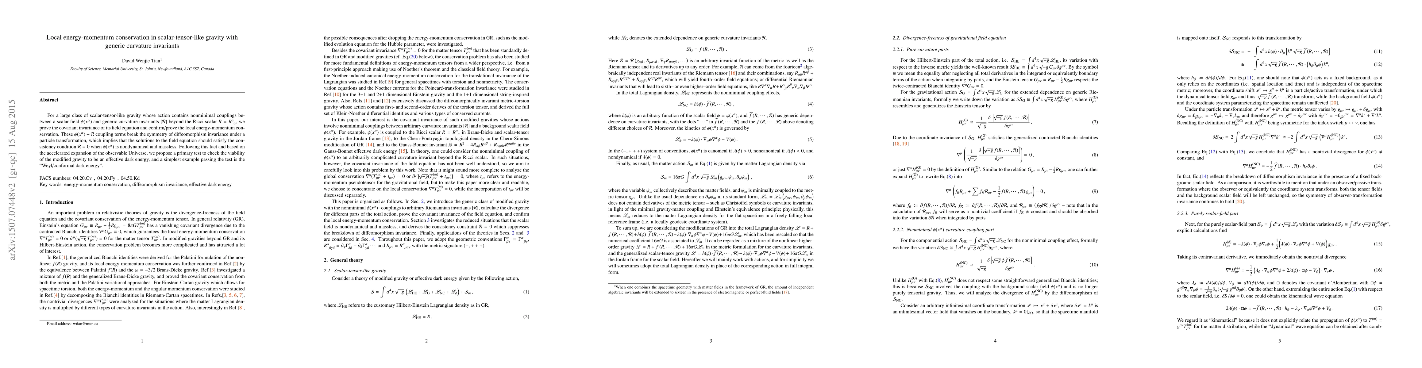 This paper proves the covariant invariance and local energy-momentum conservation in scalar-tensor-like gravity with nonminimal couplings between a scalar field and generic curvature invariants. It proposes a test for the viability of such modified gravity as an effective dark energy model, with "Weyl/conformal dark energy" as a passing example.