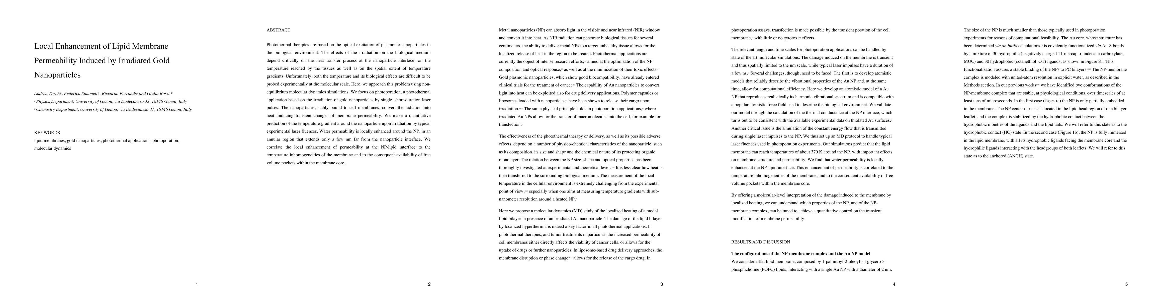 This study employs molecular dynamics simulations to predict how irradiated gold nanoparticles induce local enhancements in lipid membrane permeability. It reveals that nanoparticle-induced temperature gradients create temporary permeability changes in an annular region extending a few nm from the nanoparticle interface, correlating these effects to the resultant membrane temperature inhomogeneities and free volume pockets.