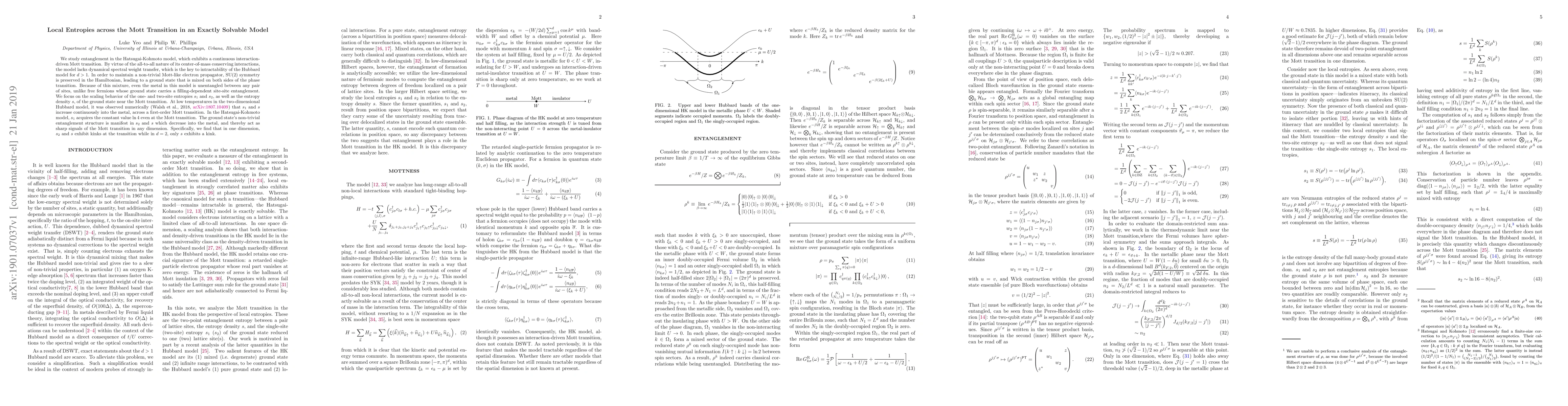 We study entanglement in the Hatsugai-Kohmoto model, which exhibits a continuous interaction-driven Mott transition. By virtue of the all-to-all nature of its center-of-mass conserving interactions, the model lacks dynamical spectral weight transfer, which is the key to intractability of the Hubbard model for $d>1$. In order to maintain a non-trivial Mott-like electron propagator, SU(2) symmetry is preserved in the Hamiltonian, leading to a ground state that is mixed on both sides of the phase transition. Because of this mixture, even the metal in this model is unentangled between any pair of sites, unlike free fermions whose ground state carries a filling-dependent site-site entanglement. We focus on the scaling behavior of the one- and two-site entropies $s_1$ and $s_2$, as well as the entropy density $s$, of the ground state near the Mott transition. At low temperatures in the two-dimensional Hubbard model, it was observed numerically (Walsh et al., 2018, arXiv:1807.10409) that $s_1$ and $s$ increase continuously into the metal, across a first-order Mott transition. In the Hatsugai-Kohmoto model, $s_1$ acquires the constant value $\ln4$ even at the Mott transition. The ground state's non-trivial entanglement structure is manifest in $s_2$ and $s$ which decrease into the metal, and thereby act as sharp signals of the Mott transition in any dimension. Specifically, we find that in one dimension, $s_2$ and $s$ exhibit kinks at the transition while in $d=2$, only $s$ exhibits a kink.