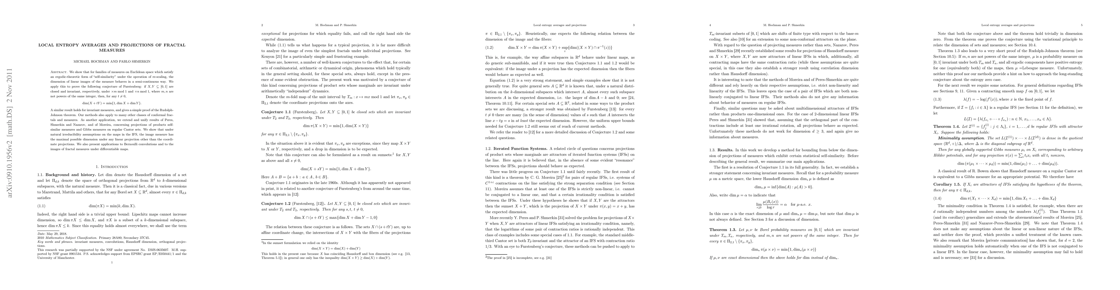 This paper explores local entropy averages and projections of fractal measures, demonstrating that the dimension of linear images of self-similar measures behaves semi-continuously. It proves Furstenberg's conjecture regarding the dimension of sums of invariant sets under modular transformations, and extends results on projections of self-similar measures and Gibbs measures on Cantor sets.