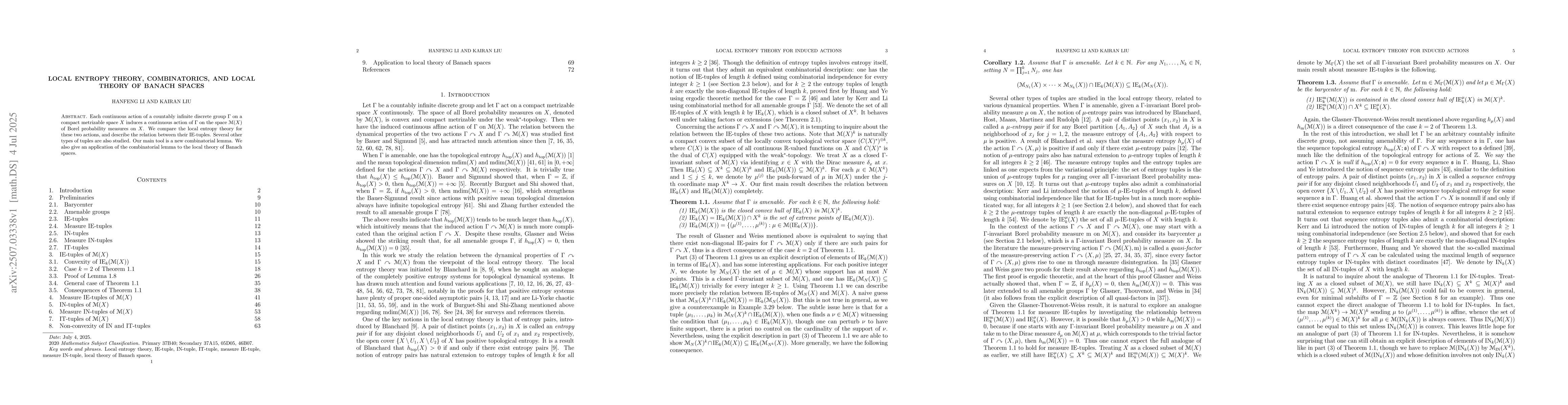 Each continuous action of a countably infinite discrete group $\Gamma$ on a compact metrizable space X induces a continuous action of $\Gamma$ on the space M(X) of Borel probability measures on X. We compare the local entropy theory for these two actions, and describe the relation between their IE-tuples. Several other types of tuples are also studied. Our main tool is a new combinatorial lemma. We also give an application of the combinatorial lemma to the local theory of Banach spaces.