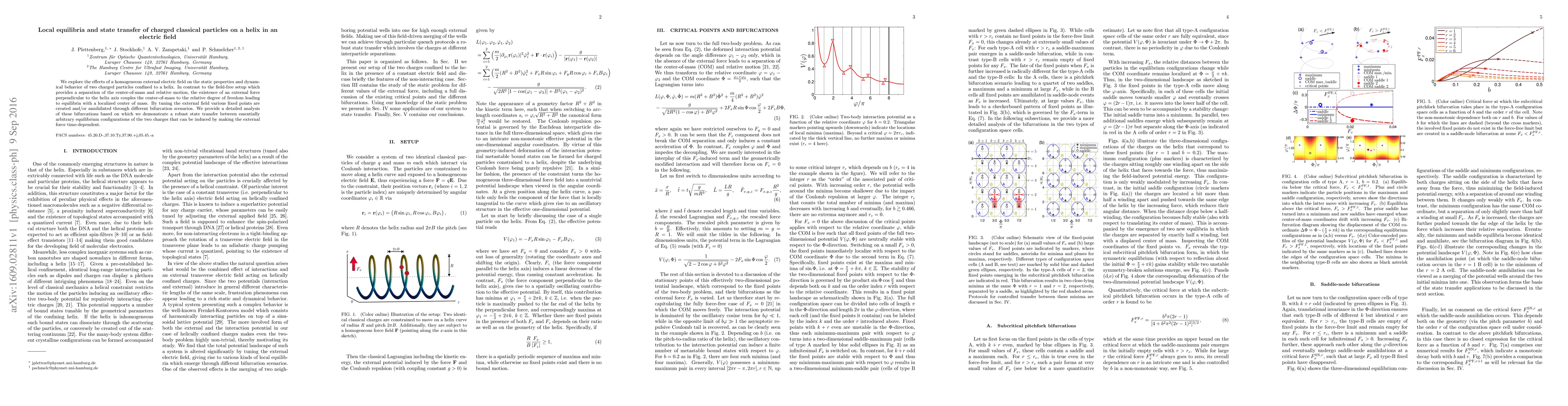 We explore the effects of a homogeneous external electric field on the static properties and dynamical behavior of two charged particles confined to a helix. In contrast to the field-free setup which provides a separation of the center-of-mass and relative motion, the existence of an external force perpendicular to the helix axis couples the center-of-mass to the relative degree of freedom leading to equilibria with a localized center of mass. By tuning the external field various fixed points are created and/or annihilated through different bifurcation scenarios. We provide a detailed analysis of these bifurcations based on which we demonstrate a robust state transfer between essentially arbitrary equilibrium configurations of the two charges that can be induced by making the external force time-dependent.