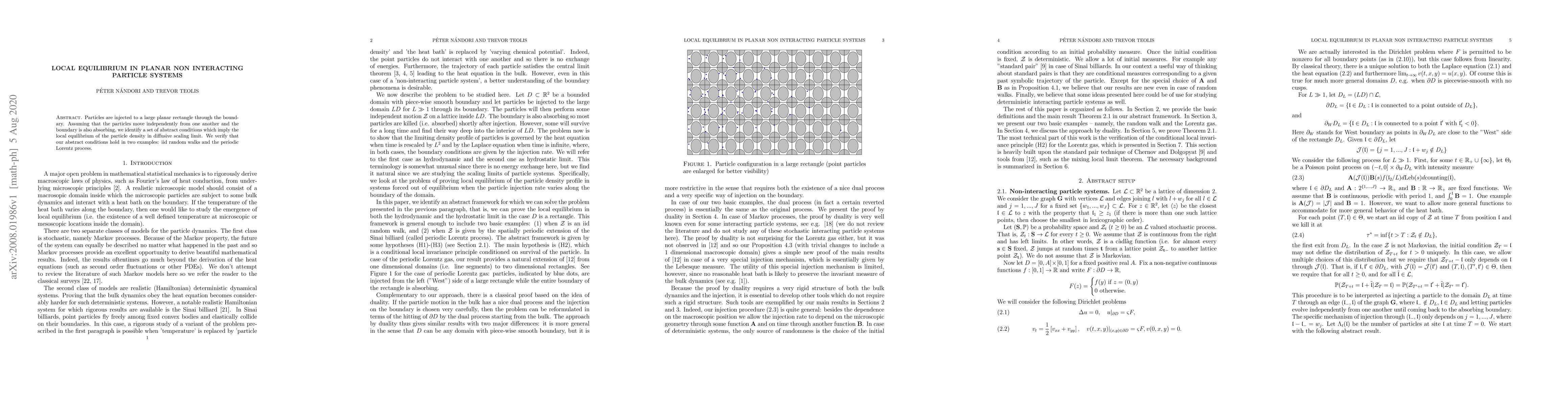 This research identifies conditions for local equilibrium of particle density in planar, non-interacting particle systems. These conditions are validated through examples like iid random walks and the periodic Lorentz process, implying that the particle distribution approaches equilibrium in the diffusive scaling limit.