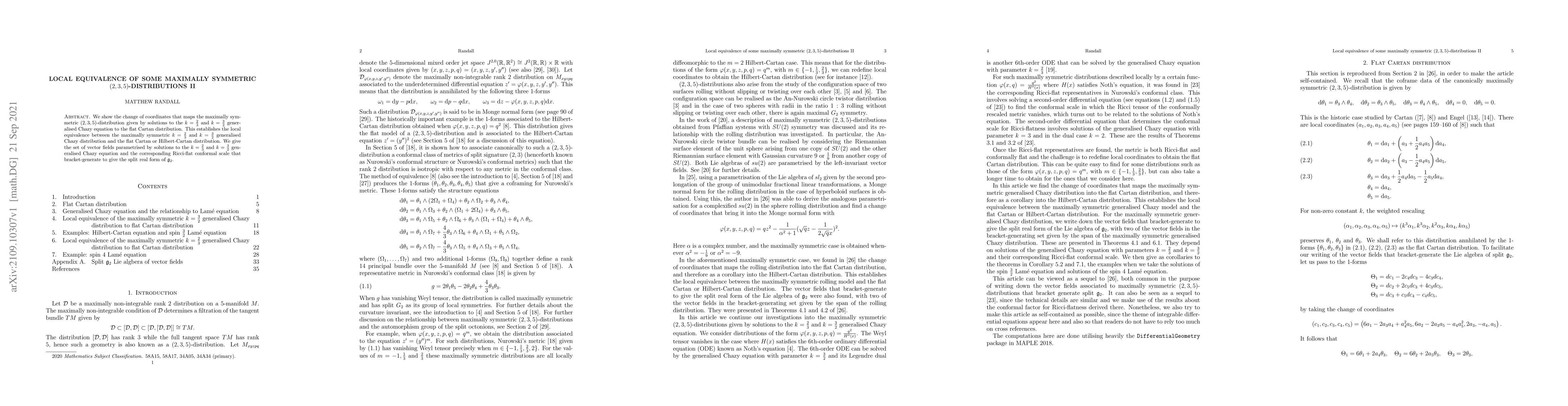 This paper demonstrates a coordinate transformation that equates two maximally symmetric $(2,3,5)$-distributions derived from $k=\frac{2}{3}$ and $k=\frac{3}{2}$ generalised Chazy equations to the flat Cartan distribution, establishing their local equivalence. It also provides the vector fields and Ricci-flat conformal scale that generate the split real form of $\frak{g}_2$.
