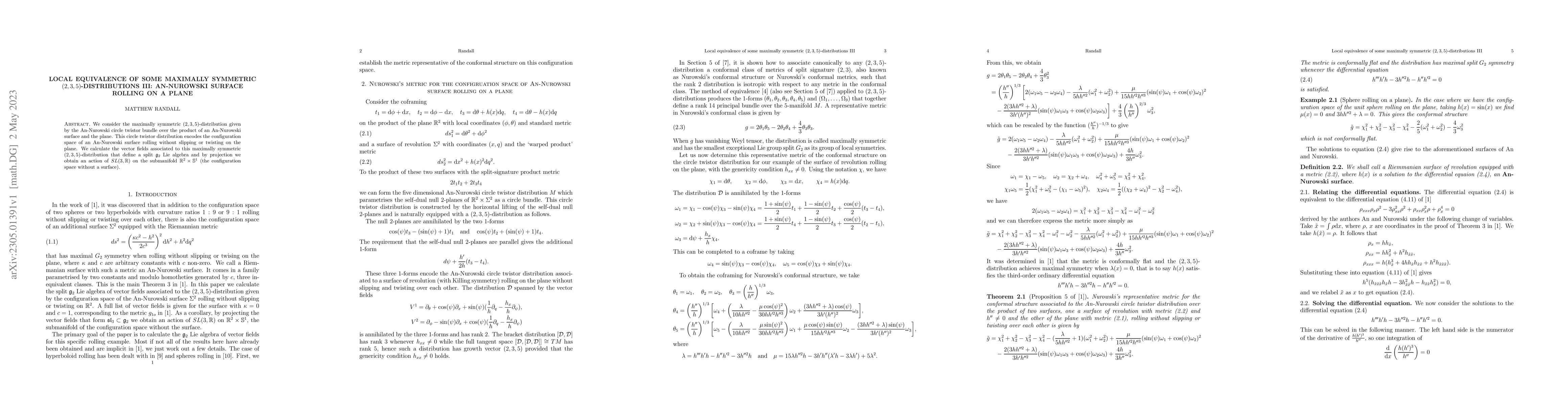 This paper investigates the maximally symmetric $(2,3,5)$-distribution represented by the An-Nurowski circle twistor bundle, focusing on the configuration space of an An-Nurowski surface rolling on a plane. It provides vector fields defining a split $\frak{g}_2$ Lie algebra and demonstrates an $SL(3,\mathbb{R})$ action on the configuration space $\mathbb{R}^2\times \mathbb{S}^1$.