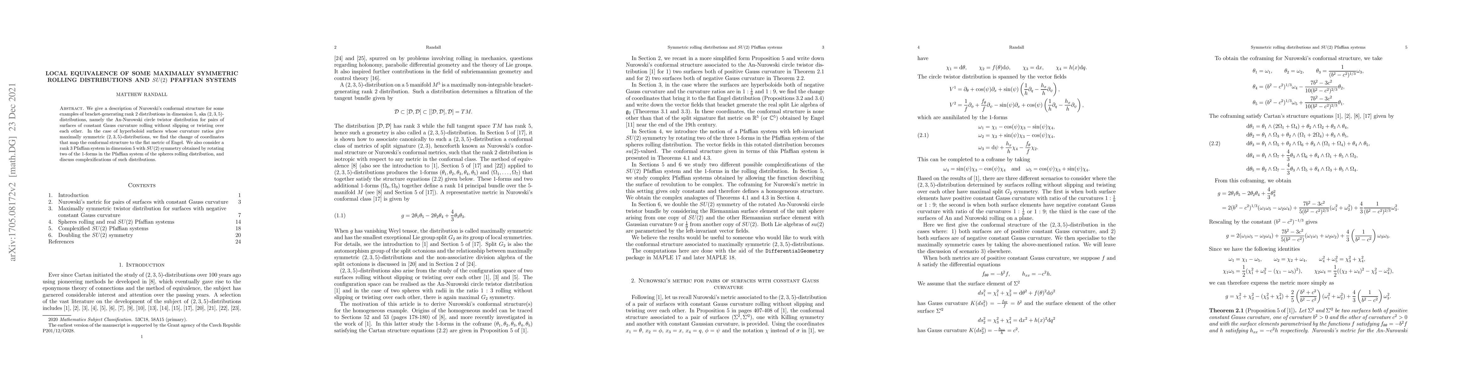 This paper explores the conformal structure of maximally symmetric rolling distributions in dimension 5, specifically the An-Nurowski circle twistor distribution for pairs of surfaces of constant Gauss curvature. It identifies a change of coordinates that maps these structures to the flat metric of Engel and examines a rank 3 Pfaffian system with $SU(2)$ symmetry derived from rolling sphere distributions.