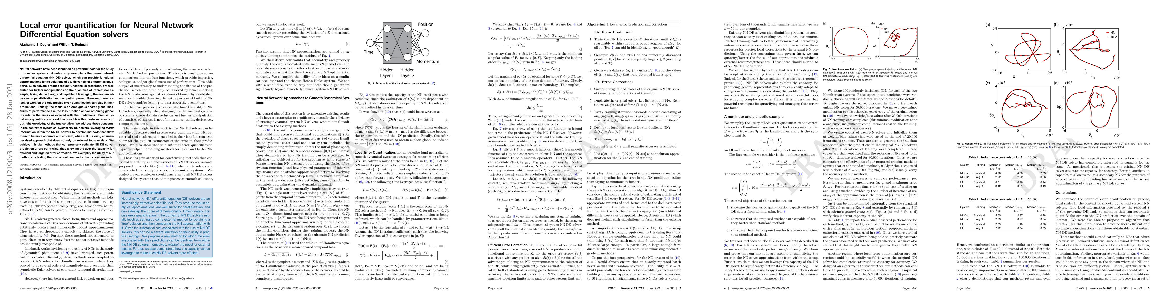 Neural networks have been identified as powerful tools for the study of complex systems. A noteworthy example is the neural network differential equation (NN DE) solver, which can provide functional approximations to the solutions of a wide variety of differential equations. Such solvers produce robust functional expressions, are well suited for further manipulations on the quantities of interest (for example, taking derivatives), and capable of leveraging the modern advances in parallelization and computing power. However, there is a lack of work on the role precise error quantification can play in their predictions: usually, the focus is on ambiguous and/or global measures of performance like the loss function and/or obtaining global bounds on the errors associated with the predictions. Precise, local error quantification is seldom possible without external means or outright knowledge of the true solution. We address these concerns in the context of dynamical system NN DE solvers, leveraging learnt information within the NN DE solvers to develop methods that allow them to be more accurate and efficient, while still pursuing an unsupervised approach that does not rely on external tools or data. We achieve this via methods that can precisely estimate NN DE solver prediction errors point-wise, thus allowing the user the capacity for efficient and targeted error correction. We exemplify the utility of our methods by testing them on a nonlinear and a chaotic system each.