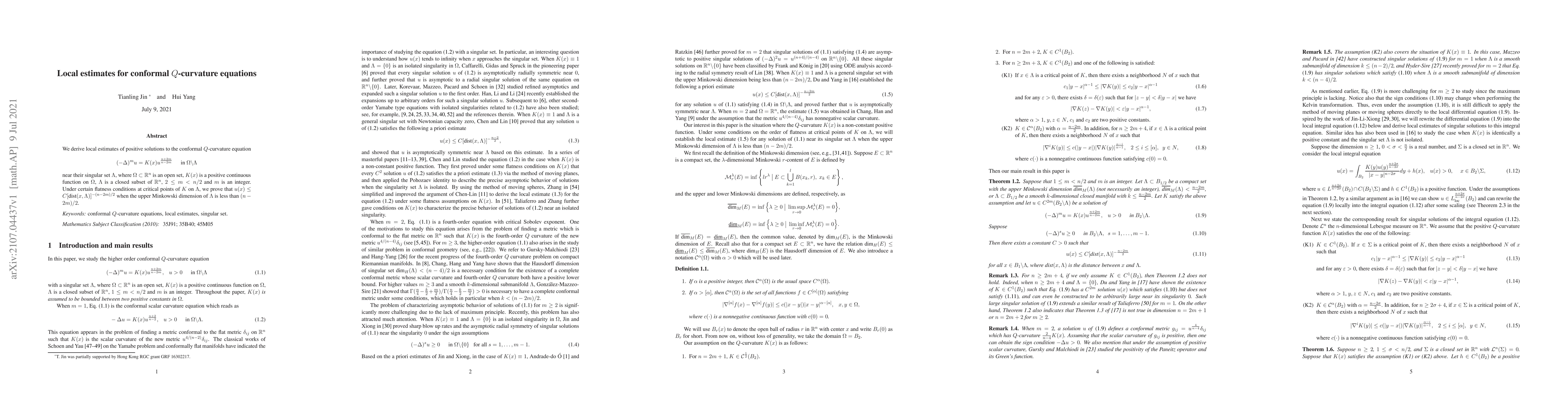 We derive local estimates of positive solutions to the conformal $Q$-curvature equation $$ (-\Delta)^m u = K(x) u^{\frac{n+2m}{n-2m}} ~~~~~~ in ~ \Omega \backslash \Lambda $$ near their singular set $\Lambda$, where $\Omega \subset \mathbb{R}^n$ is an open set, $K(x)$ is a positive continuous function on $\Omega$, $\Lambda$ is a closed subset of $\mathbb{R}^n$, $2 \leq m < n/2$ and $m$ is an integer. Under certain flatness conditions at critical points of $K$ on $\Lambda$, we prove that $u(x) \leq C [{dist}(x, \Lambda)]^{-(n-2m)/2}$ when the upper Minkowski dimension of $\Lambda$ is less than $(n-2m)/2$.