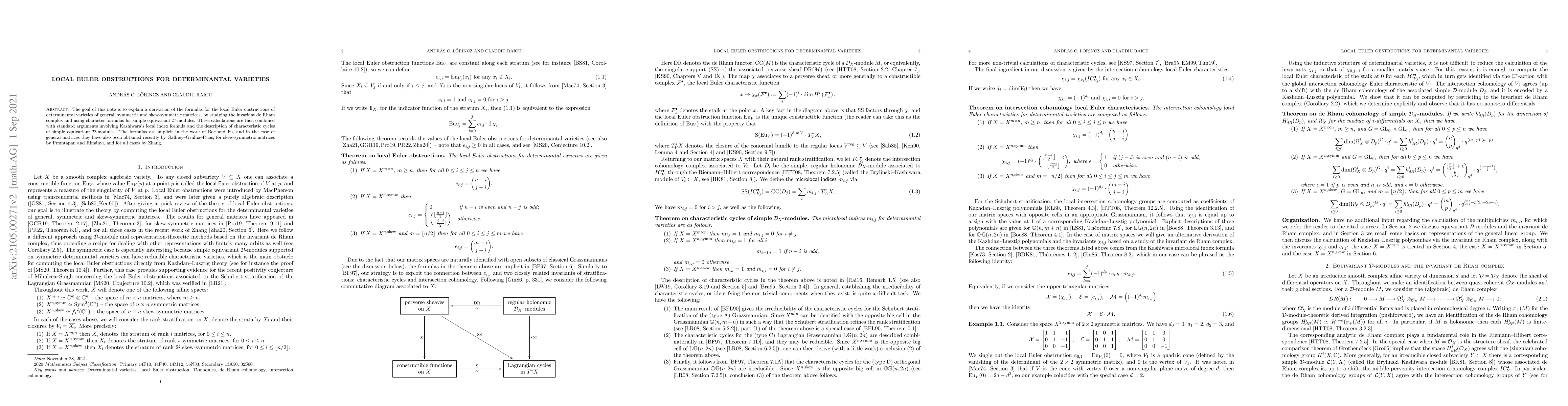 The goal of this note is to explain a derivation of the formulas for the local Euler obstructions of determinantal varieties of general, symmetric and skew-symmetric matrices, by studying the invariant de Rham complex and using character formulas for simple equivariant $D$-modules. These calculations are then combined with standard arguments involving Kashiwara's local index formula and the description of characteristic cycles of simple equivariant $D$-modules. The formulas are implicit in the work of Boe and Fu, and in the case of general matrices they have also been obtained recently by Gaffney--Grulha--Ruas, for skew-symmetric matrices by Promtapan and Rim\'anyi, and for all cases by Zhang.