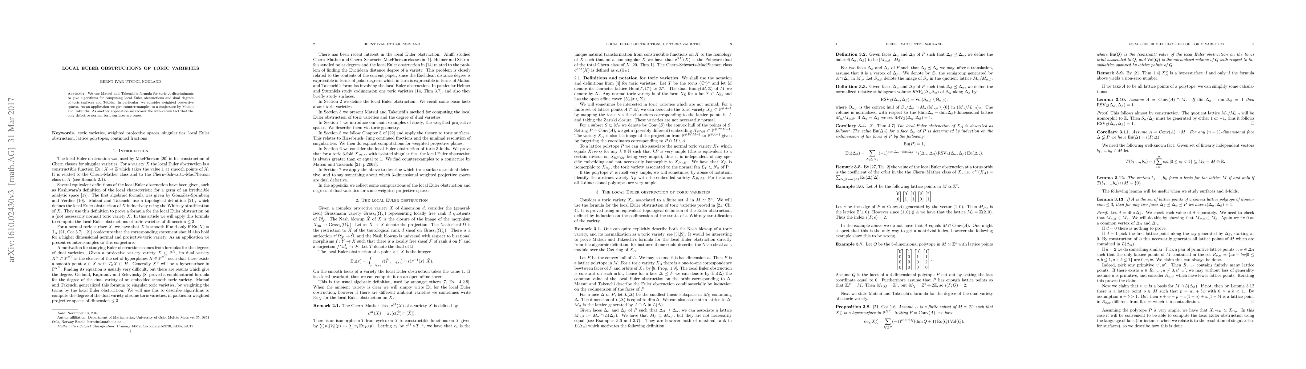We use Matsui and Takeuchi's formula for toric A-discriminants to give algorithms for computing local Euler obstructions and dual degrees of toric surfaces and 3-folds. In particular, we consider weighted projective spaces. As an application we give counterexamples to a conjecture by Matsui and Takeuchi. As another application we recover the well-known fact that the only defective normal toric surfaces are cones.