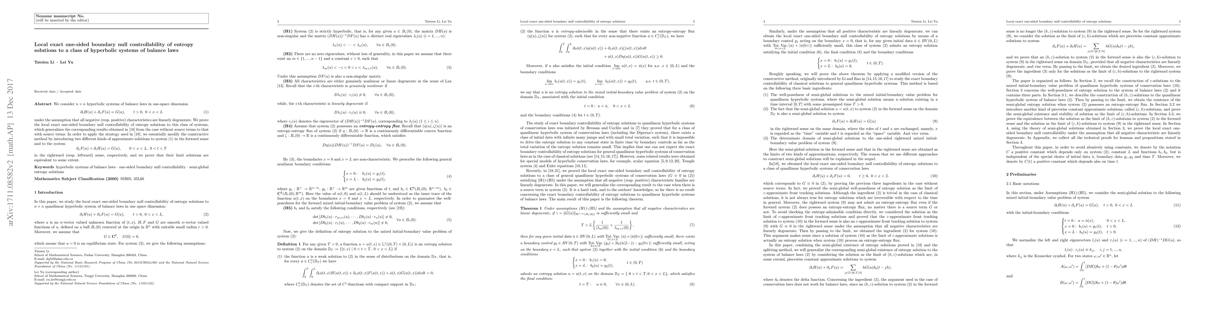 This paper proves local exact one-sided boundary null controllability for entropy solutions of degenerate hyperbolic systems of balance laws with source terms. The authors extend previous results by introducing modified approximate solutions and demonstrating their equivalence.