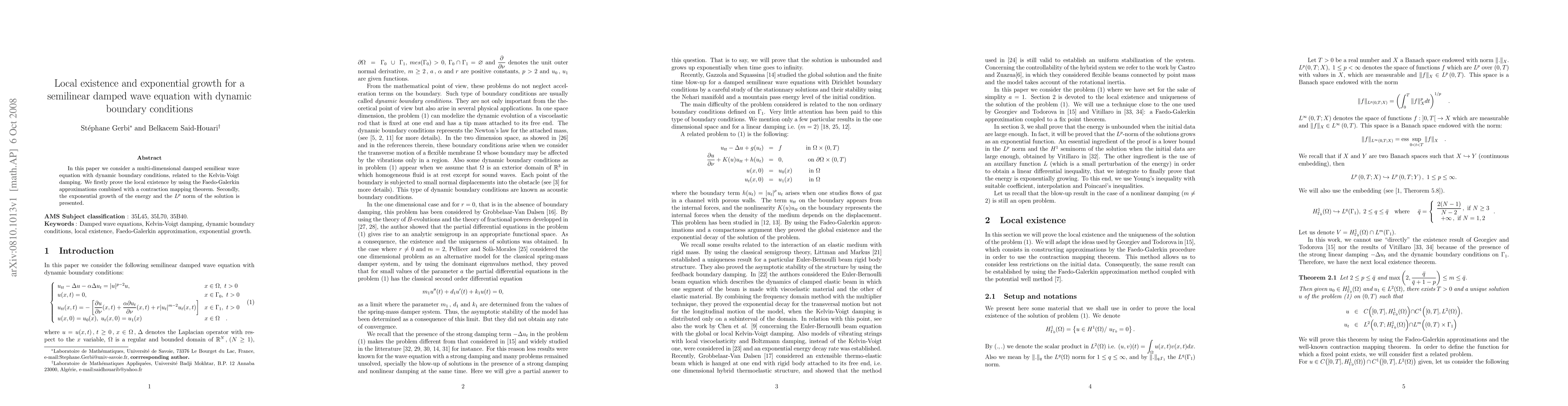 This paper proves local existence for a multi-dimensional damped semilinear wave equation with dynamic boundary conditions using Faedo-Galerkin approximations and a contraction mapping theorem. It also demonstrates the exponential growth of the solution's energy and $L^p$ norm.