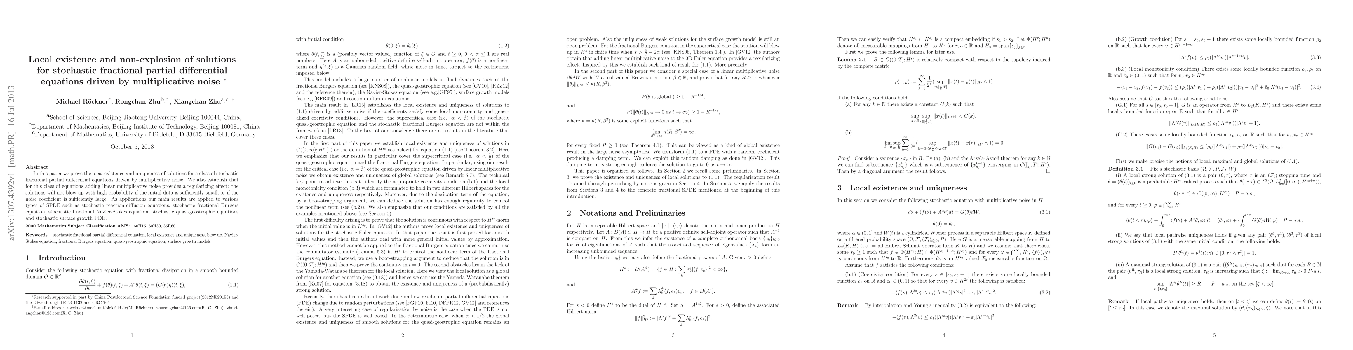 This paper proves local existence and uniqueness for stochastic fractional partial differential equations driven by multiplicative noise, demonstrating that such noise acts as a regularizer, preventing solution blow-up under certain conditions. The findings are applied to various types of SPDEs, including reaction-diffusion, Burgers, Navier-Stokes, quasi-geostrophic, and surface growth equations.