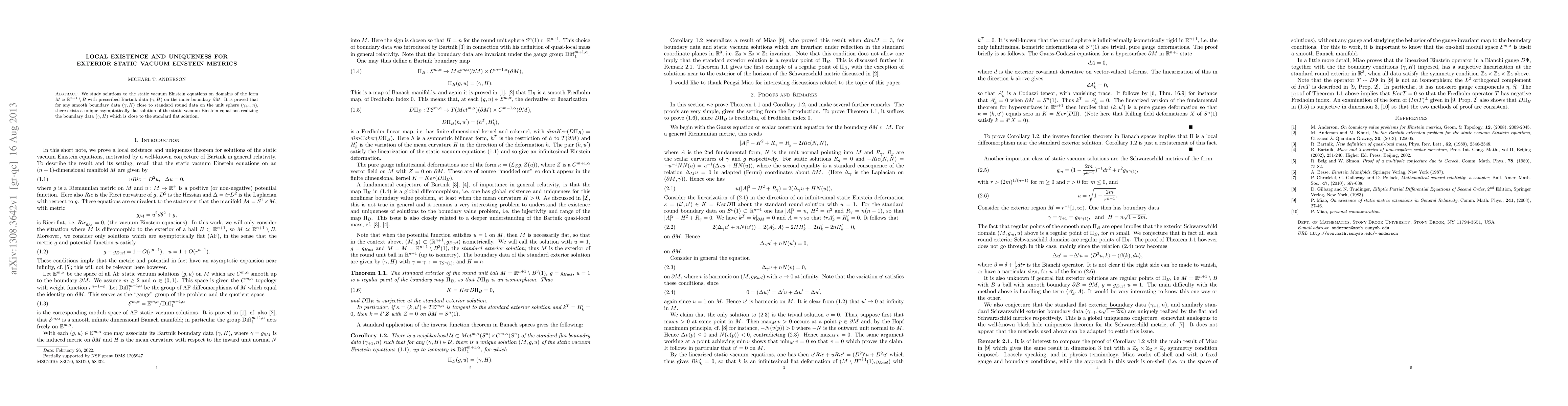 This paper proves the local existence and uniqueness of solutions to the static vacuum Einstein equations in exterior domains, demonstrating that for prescribed boundary data resembling the standard flat boundary in Euclidean space, there exists a unique solution that closely approximates the flat solution.