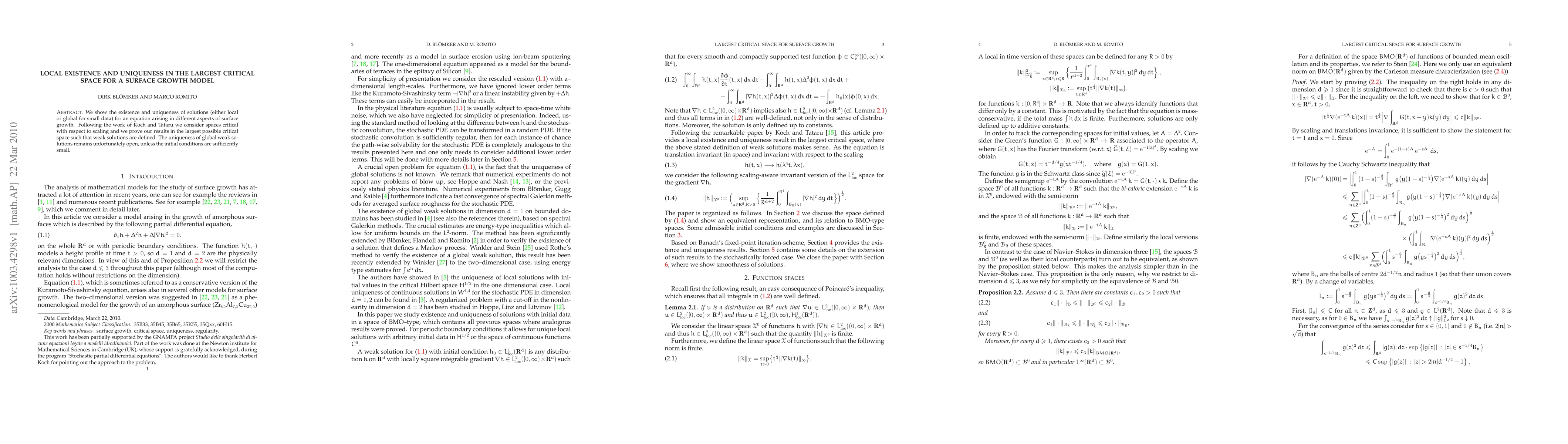 We show the existence and uniqueness of solutions (either local or global for small data) for an equation arising in different aspects of surface growth. Following the work of Koch and Tataru we consider spaces critical with respect to scaling and we prove our results in the largest possible critical space such that weak solutions are defined. The uniqueness of global weak solutions remains unfortunately open, unless the initial conditions are sufficiently small.