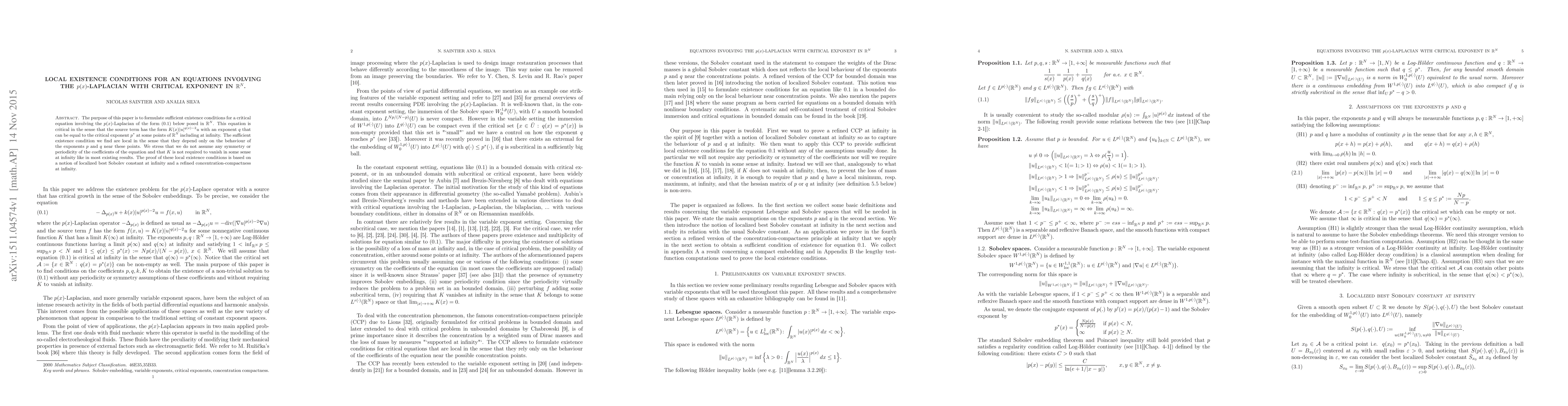 This paper establishes sufficient local existence conditions for a critical equation involving the $p(x)$-Laplacian in $\mathbb{R}^N$, where the source term may reach the critical exponent $p^*$. The conditions depend solely on the behavior of the exponents near critical points and do not require symmetry or specific behavior of the kernel function at infinity.