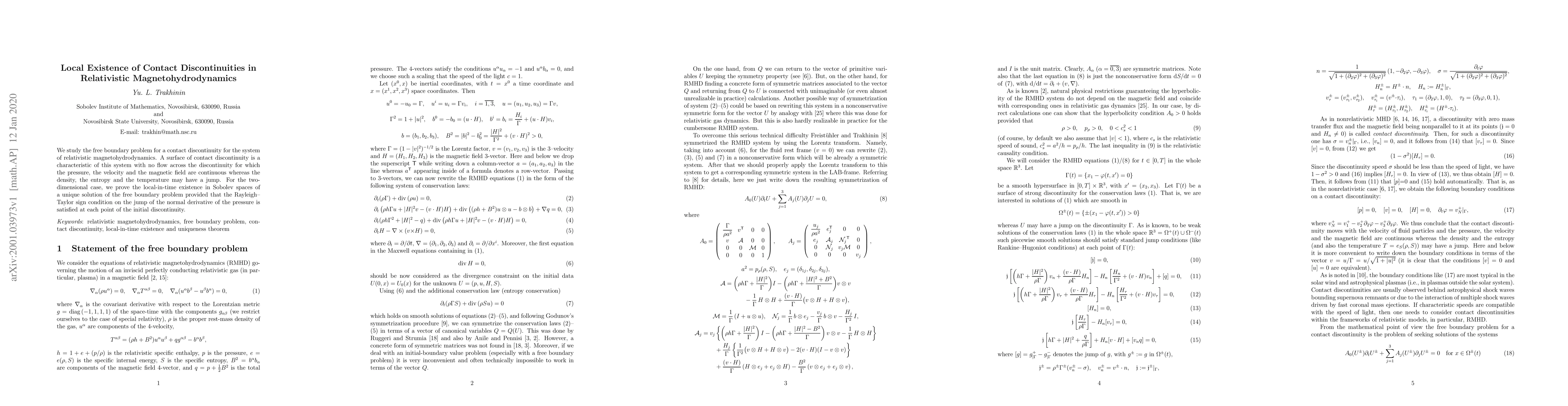 We study the free boundary problem for a contact discontinuity for the system of relativistic magnetohydrodynamics. A surface of contact discontinuity is a characteristic of this system with no flow across the discontinuity for which the pressure, the velocity and the magnetic field are continuous whereas the density, the entropy and the temperature may have a jump. For the two-dimensional case, we prove the local-in-time existence in Sobolev spaces of a unique solution of the free boundary problem provided that the Rayleigh--Taylor sign condition on the jump of the normal derivative of the pressure is satisfied at each point of the initial discontinuity.