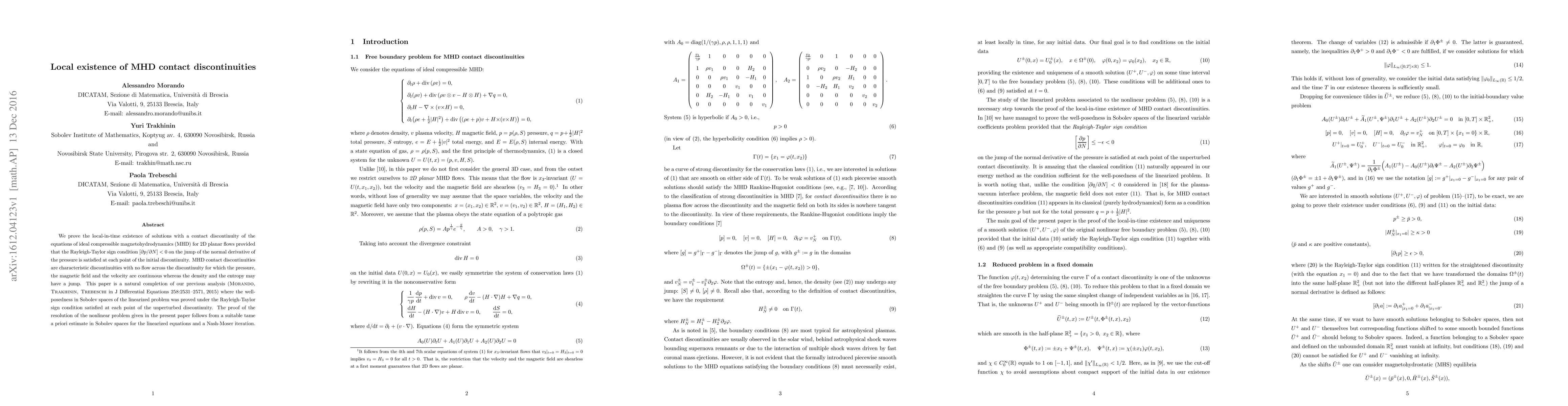 This paper proves the local-in-time existence of solutions to the ideal compressible magnetohydrodynamics (MHD) equations featuring a contact discontinuity in 2D planar flows, provided the Rayleigh-Taylor sign condition is met. The method uses a tame a priori estimate and Nash-Moser iteration to resolve the nonlinear problem.