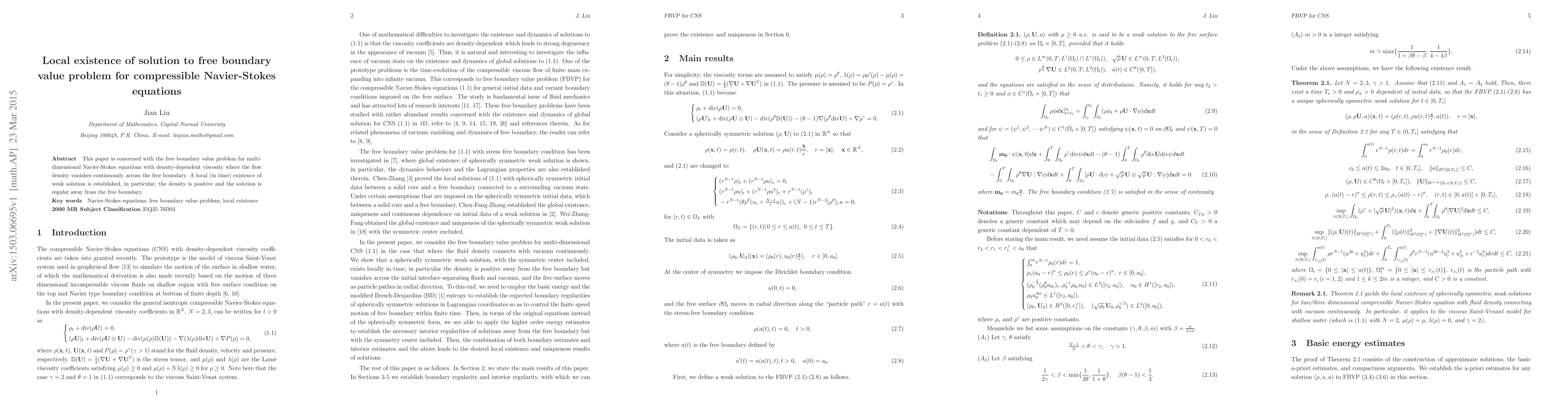 This paper is concerned with the free boundary value problem for multi-dimensional Navier-Stokes equations with density-dependent viscosity where the flow density vanishes continuously across the free boundary. A local (in time) existence of weak solution is established, in particular, the density is positive and the solution is regular away from the free boundary.