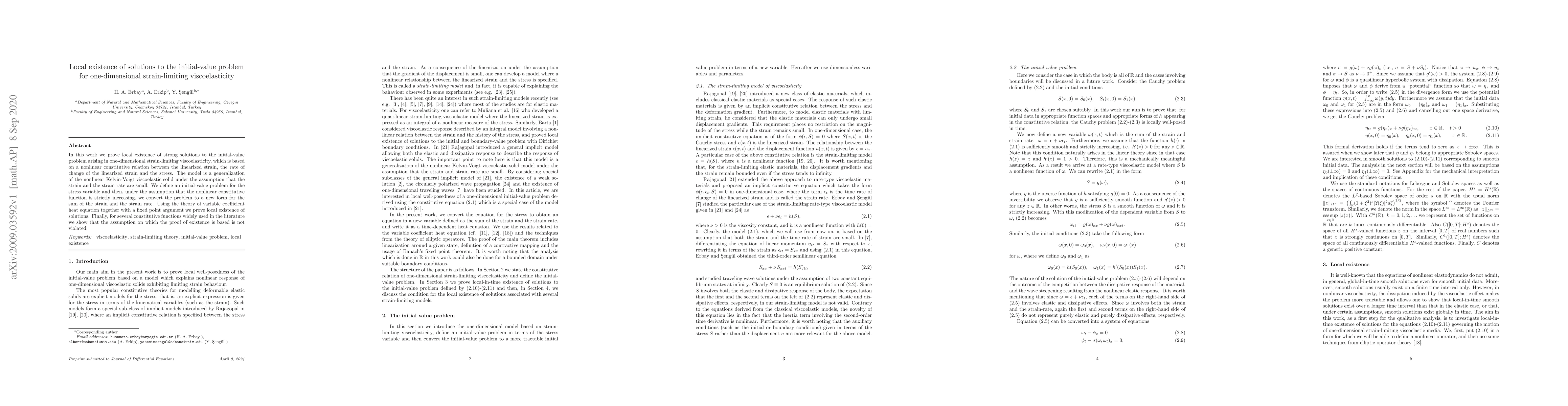This paper proves local existence of strong solutions for the initial-value problem in one-dimensional strain-limiting viscoelasticity, based on a nonlinear constitutive relation. The authors use a fixed point argument and variable coefficient heat equation theory to establish the existence, and verify that common constitutive functions do not violate the necessary assumptions.
