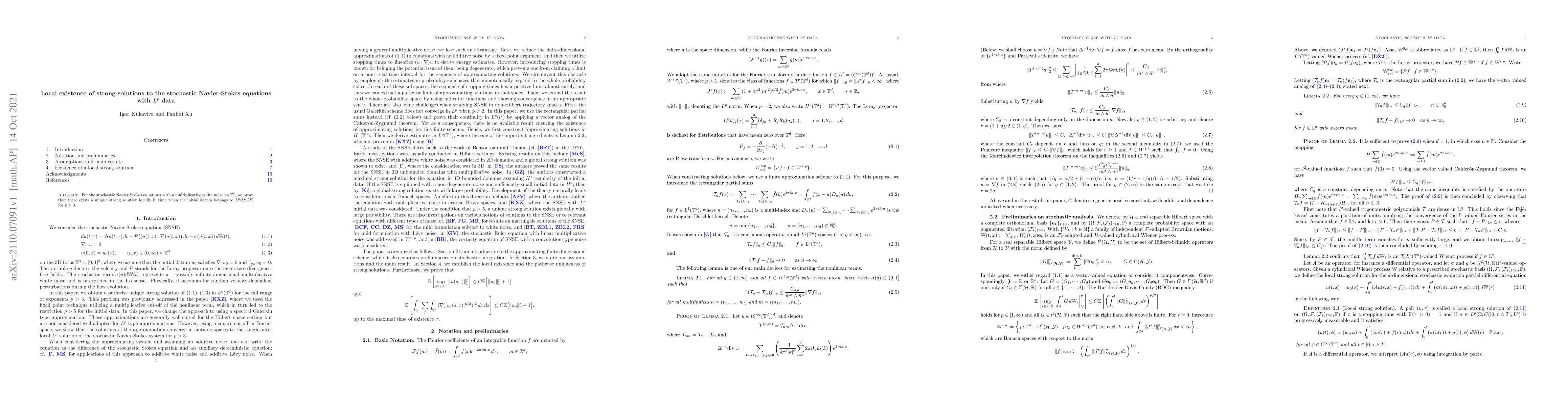 Summary: This paper proves the local existence and uniqueness of strong solutions to stochastic Navier-Stokes equations driven by multiplicative white noise, provided the initial data is in $L^p(\Omega; L^p)$ for $p > 3$. The result establishes the well-posedness of the stochastic system under specified $L^p$ conditions.