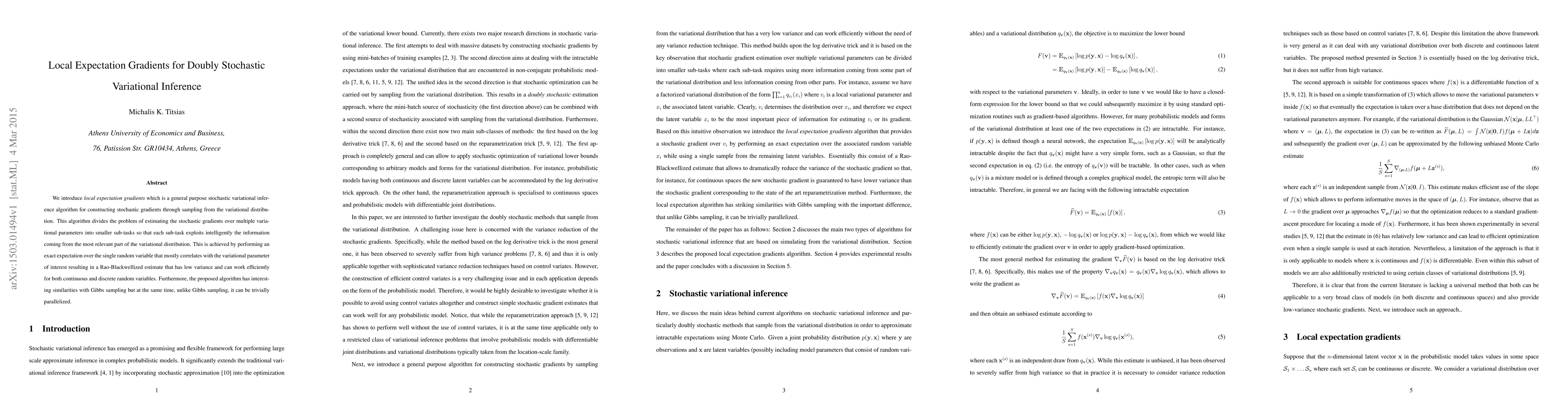 This paper proposes a novel stochastic variational inference algorithm called local expectation gradients, which efficiently computes stochastic gradients by exploiting information from the most relevant part of the variational distribution. Unlike Gibbs sampling, it can be easily parallelized while achieving low-variance estimates for both continuous and discrete random variables.