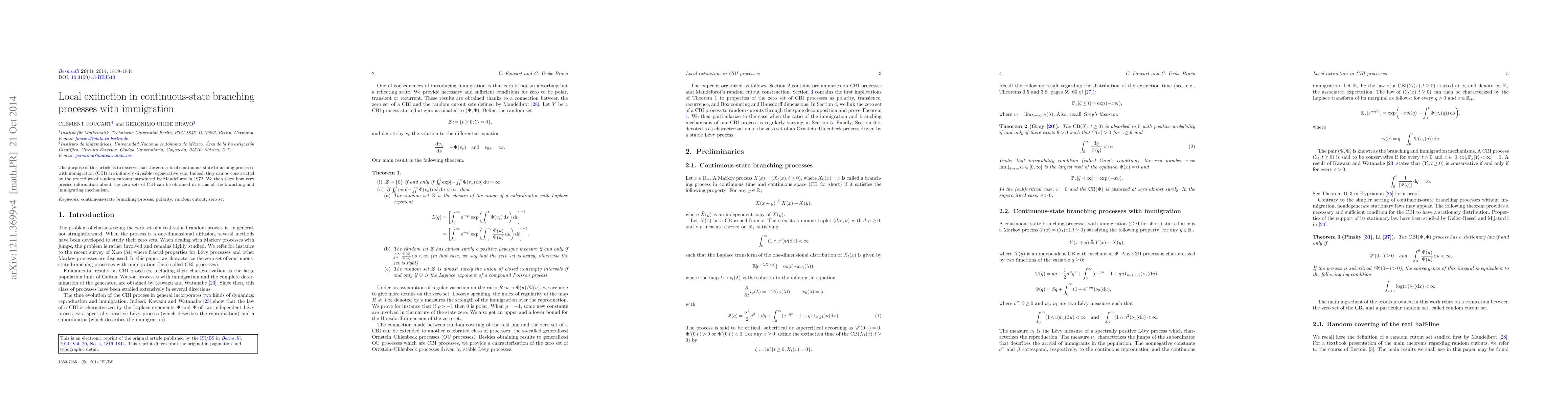 The purpose of this article is to observe that the zero sets of continuous-state branching processes with immigration (CBI) are infinitely divisible regenerative sets. Indeed, they can be constructed by the procedure of random cutouts introduced by Mandelbrot in 1972. We then show how very precise information about the zero sets of CBI can be obtained in terms of the branching and immigrating mechanism.