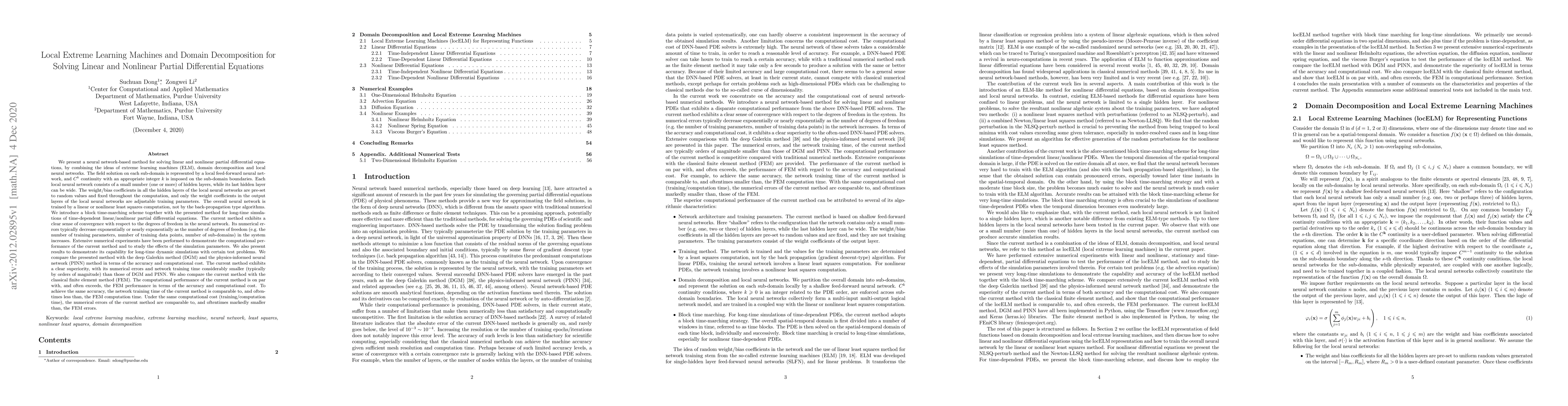 This research introduces a novel method for solving linear and nonlinear partial differential equations using a combination of extreme learning machines, domain decomposition, and local neural networks. The approach outperforms deep Galerkin method (DGM) and physics-informed neural network (PINN) in terms of accuracy and computational cost, and often matches or surpasses the classical finite element method (FEM).