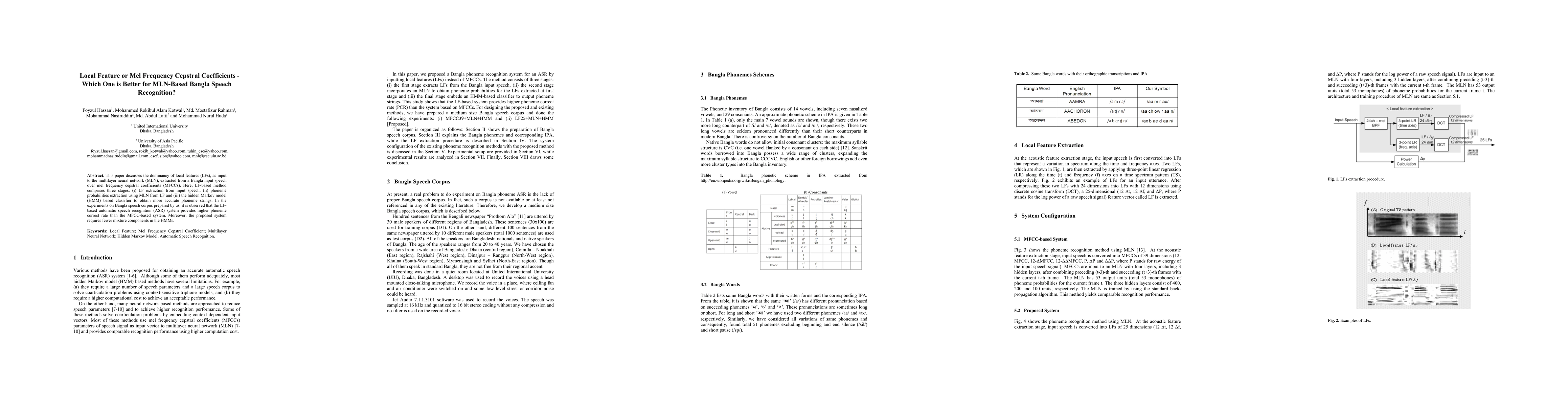 This paper discusses the dominancy of local features (LFs), as input to the multilayer neural network (MLN), extracted from a Bangla input speech over mel frequency cepstral coefficients (MFCCs). Here, LF-based method comprises three stages: (i) LF extraction from input speech, (ii) phoneme probabilities extraction using MLN from LF and (iii) the hidden Markov model (HMM) based classifier to obtain more accurate phoneme strings. In the experiments on Bangla speech corpus prepared by us, it is observed that the LFbased automatic speech recognition (ASR) system provides higher phoneme correct rate than the MFCC-based system. Moreover, the proposed system requires fewer mixture components in the HMMs.