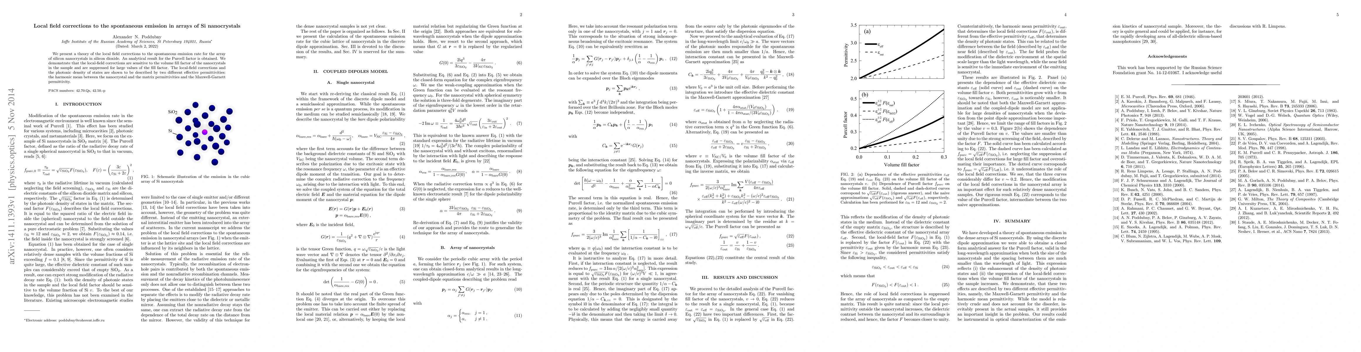 This paper develops a theoretical framework for local field corrections affecting the spontaneous emission in arrays of silicon nanocrystals embedded in silicon dioxide, deriving an analytical Purcell factor. The study reveals that these corrections are influenced by the nanocrystal volume fill factor, being diminished at high fill factors.