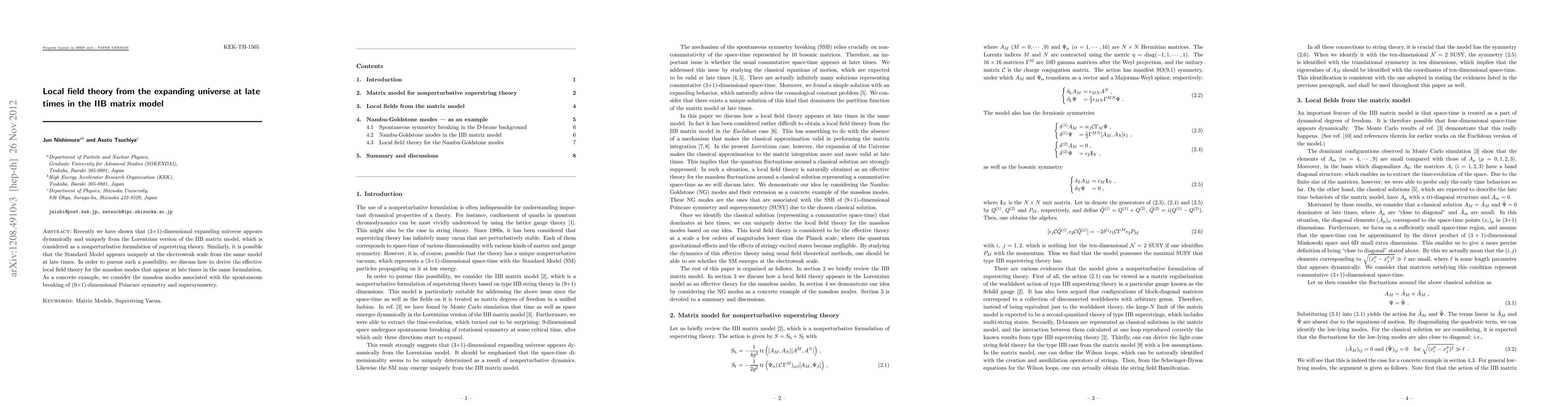 Recently we have shown that (3+1)-dimensional expanding universe appears dynamically and uniquely from the Lorentzian version of the IIB matrix model, which is considered as a nonperturbative formulation of superstring theory. Similarly, it is possible that the Standard Model appears uniquely at the electroweak scale from the same model at late times. In order to pursue such a possibility, we discuss how to derive the effective local field theory for the massless modes that appear at late times in the same formulation. As a concrete example, we consider the massless modes associated with the spontaneous breaking of (9+1)-dimensional Poincare symmetry and supersymmetry.