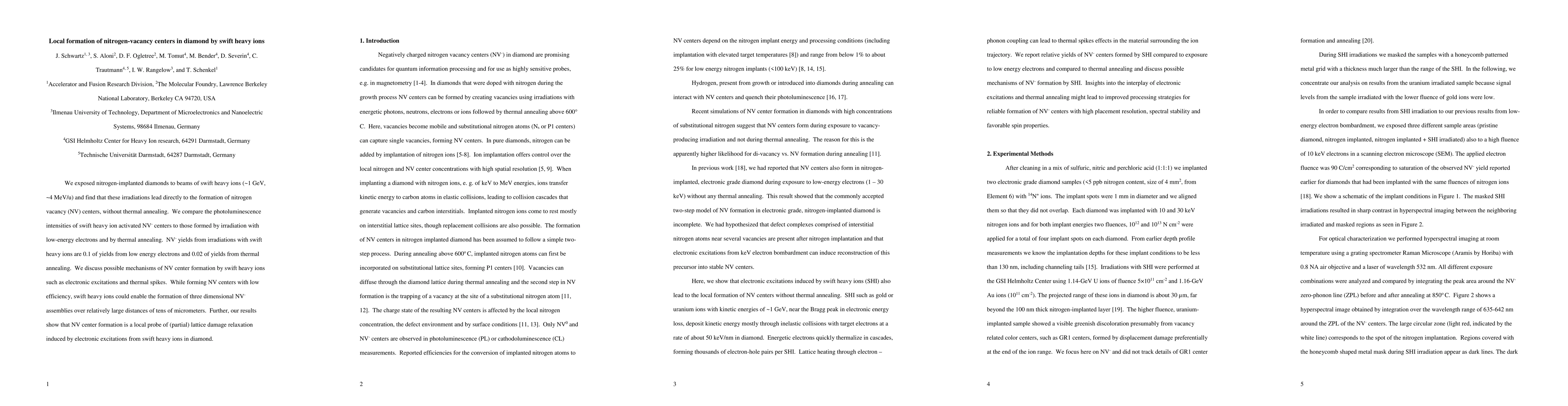 This study demonstrates the formation of nitrogen-vacancy (NV) centers in nitrogen-implanted diamonds via swift uranium and gold ion irradiation, achieving NV yields lower than those from low-energy electron irradiation or thermal annealing. The method enables the formation of three-dimensional NV assemblies over large distances, indicating NV-center formation as a local probe of lattice damage relaxation.