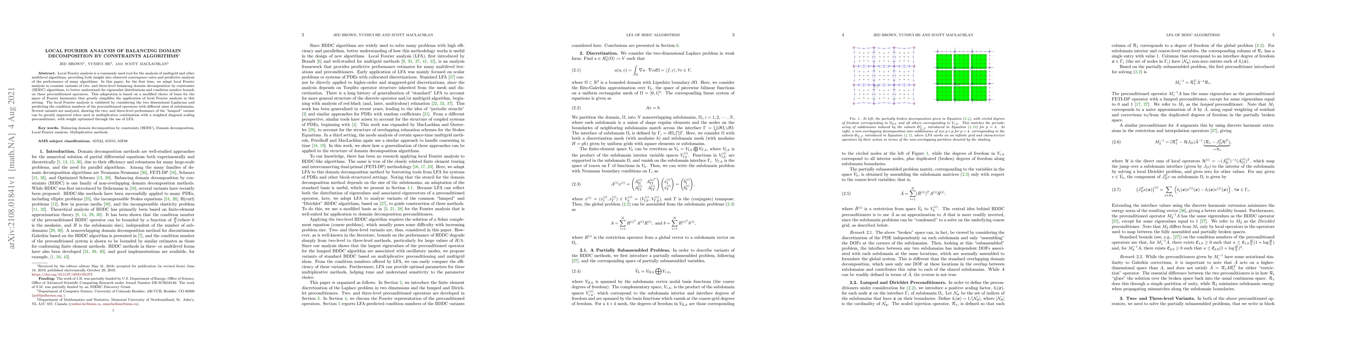 Local Fourier analysis is a commonly used tool for the analysis of multigrid and other multilevel algorithms, providing both insight into observed convergence rates and predictive analysis of the performance of many algorithms. In this paper, for the first time, we adapt local Fourier analysis to examine variants of two- and three-level balancing domain decomposition by constraints (BDDC) algorithms, to better understand the eigenvalue distributions and condition number bounds on these preconditioned operators. This adaptation is based on a modified choice of basis for the space of Fourier harmonics that greatly simplifies the application of local Fourier analysis in this setting. The local Fourier analysis is validated by considering the two dimensional Laplacian and predicting the condition numbers of the preconditioned operators with different sizes of subdomains. Several variants are analyzed, showing the two- and three-level performance of the "lumped" variant can be greatly improved when used in multiplicative combination with a weighted diagonal scaling preconditioner, with weight optimized through the use of LFA.