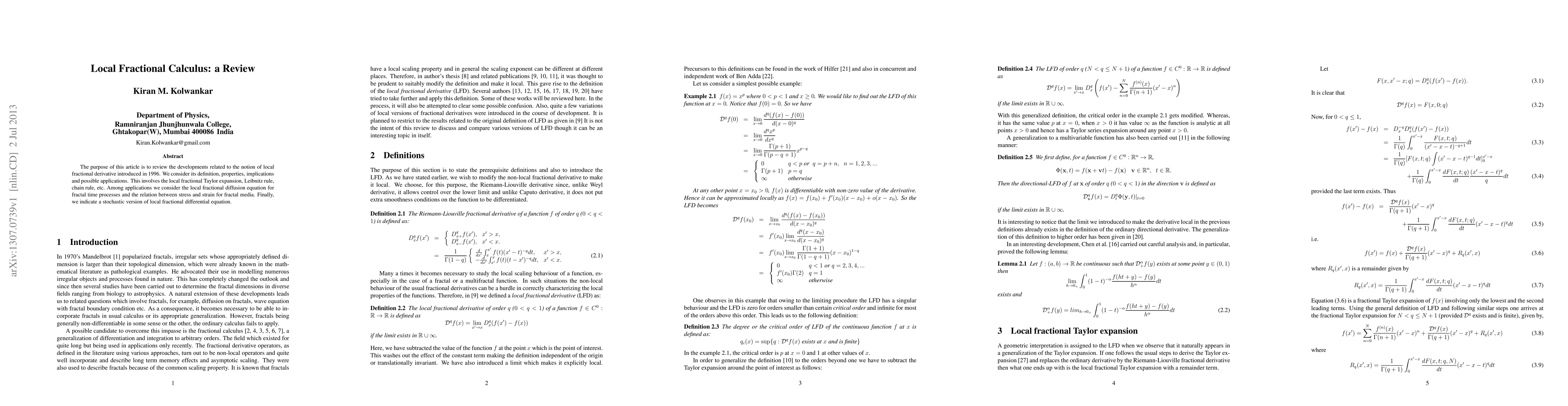The purpose of this article is to review the developments related to the notion of local fractional derivative introduced in 1996. We consider its definition, properties, implications and possible applications. This involves the local fractional Taylor expansion, Leibnitz rule, chain rule, etc. Among applications we consider the local fractional diffusion equation for fractal time processes and the relation between stress and strain for fractal media. Finally, we indicate a stochastic version of local fractional differential equation.