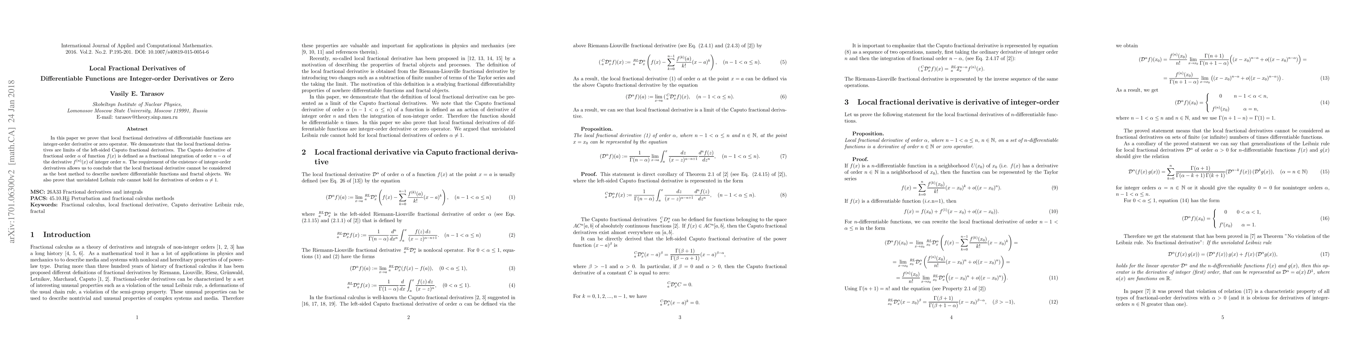 In this paper we prove that local fractional derivatives of differentiable functions are integer-order derivative or zero operator. We demonstrate that the local fractional derivatives are limits of the left-sided Caputo fractional derivatives. The Caputo derivative of fractional order alpha of function f(x) is defined as a fractional integration of order (n-alpha) of the derivative f^(n)(x) of integer order n. The requirement of the existence of integer-order derivatives allows us to conclude that the local fractional derivative cannot be considered as the best method to describe nowhere differentiable functions and fractal objects. We also prove that unviolated Leibniz rule cannot hold for derivatives of orders alpha, which are not equal to one.