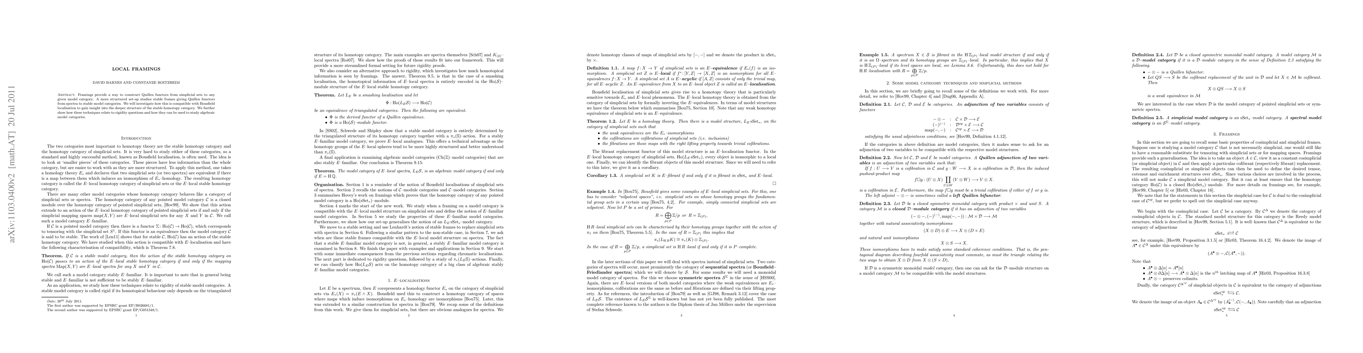 Framings provide a way to construct Quillen functors from simplicial sets to any given model category. A more structured set-up studies stable frames giving Quillen functors from spectra to stable model categories. We will investigate how this is compatible with Bousfield localisation to gain insight into the deeper structure of the stable homotopy category. We further show how these techniques relate to rigidity questions and how they can be used to study algebraic model categories.