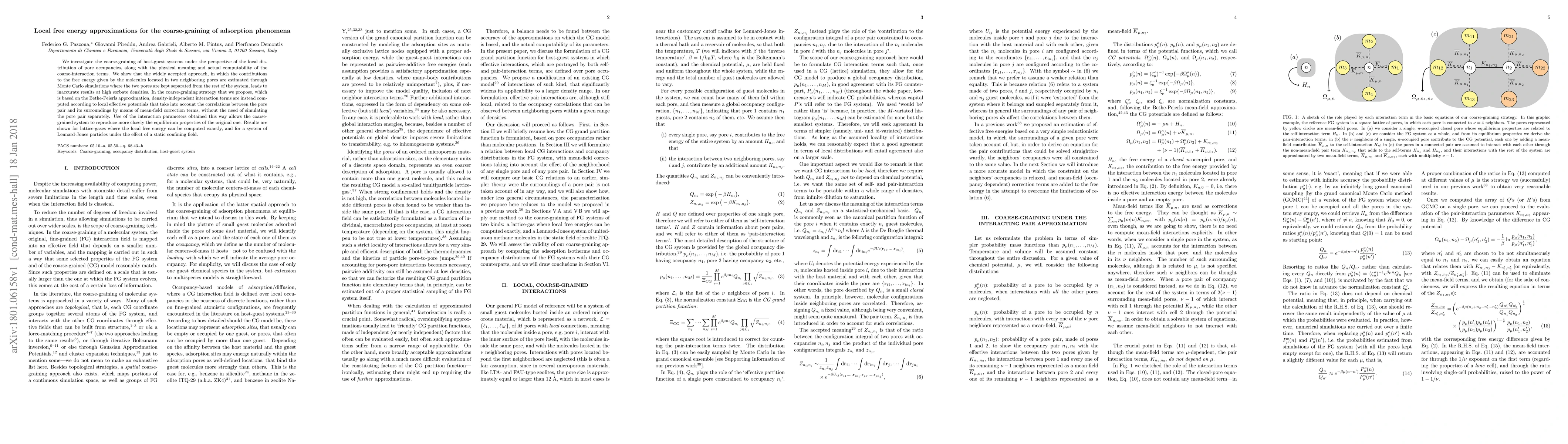 We investigate the coarse-graining of host-guest systems under the perspective of the local distribution of pore occupancies, along with the physical meaning and actual computability of the coarse-interaction terms. We show that the widely accepted approach, in which the contributions to the free energy given by the molecules located in two neighboring pores are estimated through Monte Carlo simulations where the two pores are kept separated from the rest of the system, leads to inaccurate results at high sorbate densities. In the coarse-graining strategy that we propose, which is based on the Bethe-Peierls approximation, density-independent interaction terms are instead computed according to local effective potentials that take into account the correlations between the pore pair and its surroundings by means of mean-field correction terms, without the need of simulating the pore pair separately. Use of the interaction parameters obtained this way allows the coarse-grained system to reproduce more closely the equilibrium properties of the original one. Results are shown for lattice-gases where the local free energy can be computed exactly, and for a system of Lennard-Jones particles under the effect of a static confining field.