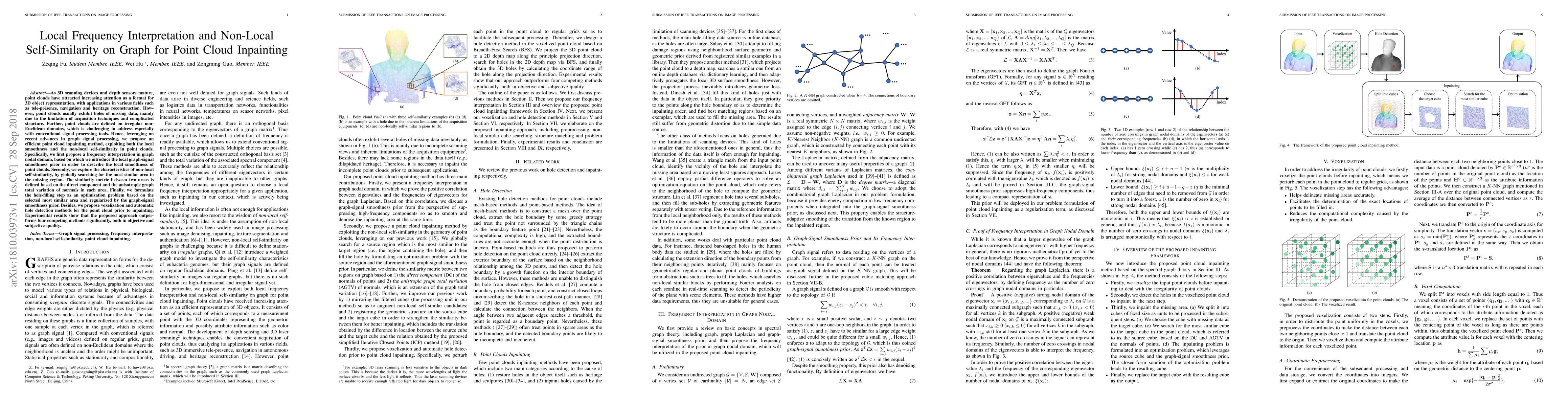 This paper proposes an efficient method for point cloud inpainting by leveraging local frequency interpretation and non-local self-similarity on graph structures. The approach utilizes local smoothness and globally searches for similar regions to fill missing data, achieving superior results compared to competing methods.