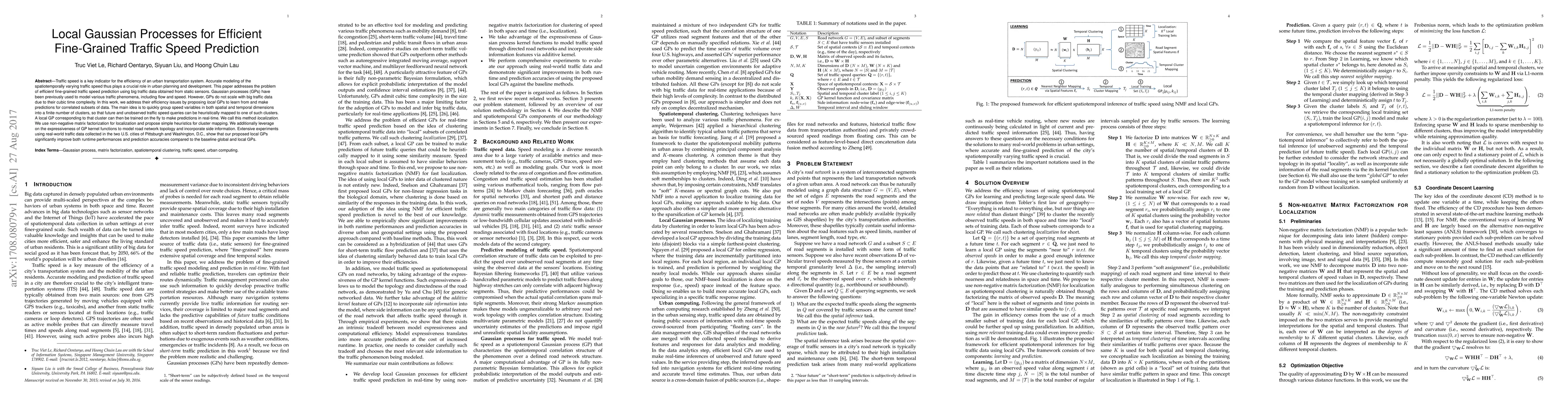 This paper proposes local Gaussian processes for efficient fine-grained traffic speed prediction using big data from static sensors. The method clusters data spatially and temporally to quickly map new queries to local GPs, improving both runtime performance and prediction accuracy compared to global GPs.