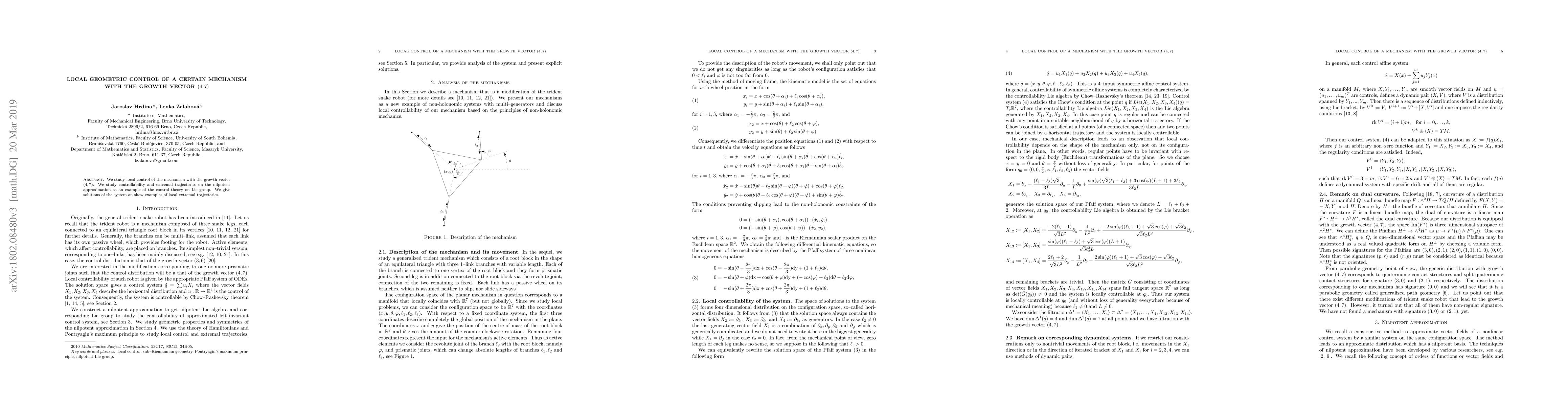 We study local control of the mechanism with the growth vector (4,7). We study controllability and extremal trajectories on the nilpotent approximation as an example of the control theory on Lie group. We give solutions of the system an show examples of local extremal trajectories.
