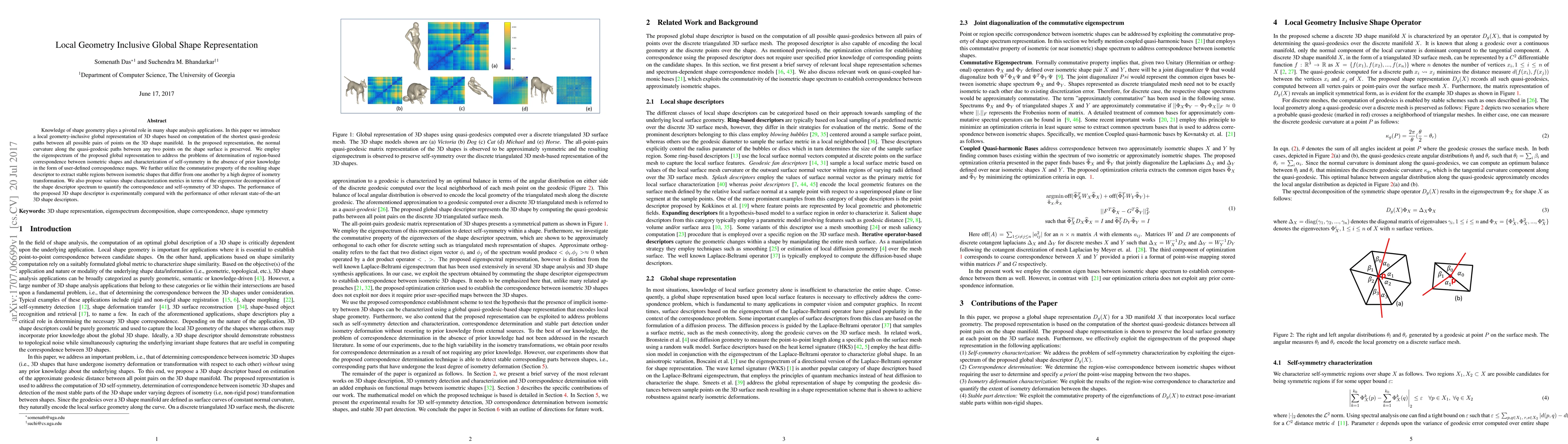 Knowledge of shape geometry plays a pivotal role in many shape analysis applications. In this paper we introduce a local geometry-inclusive global representation of 3D shapes based on computation of the shortest quasi-geodesic paths between all possible pairs of points on the 3D shape manifold. In the proposed representation, the normal curvature along the quasi-geodesic paths between any two points on the shape surface is preserved. We employ the eigenspectrum of the proposed global representation to address the problems of determination of region-based correspondence between isometric shapes and characterization of self-symmetry in the absence of prior knowledge in the form of user-defined correspondence maps. We further utilize the commutative property of the resulting shape descriptor to extract stable regions between isometric shapes that differ from one another by a high degree of isometry transformation. We also propose various shape characterization metrics in terms of the eigenvector decomposition of the shape descriptor spectrum to quantify the correspondence and self-symmetry of 3D shapes. The performance of the proposed 3D shape descriptor is experimentally compared with the performance of other relevant state-of-the-art 3D shape descriptors.