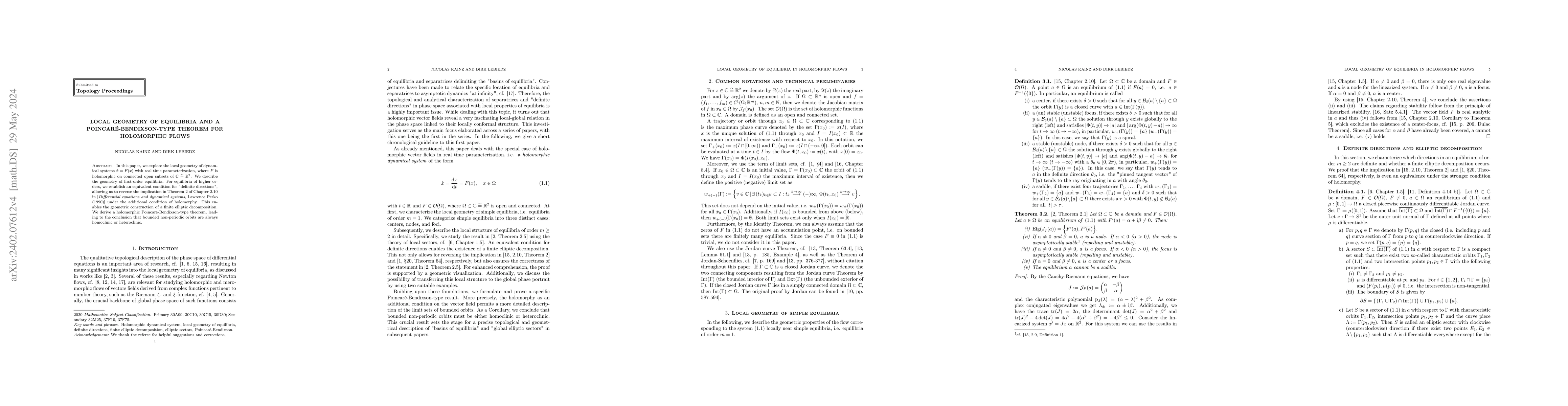 This paper investigates the local geometry of holomorphic dynamical systems, specifically focusing on first-order equilibria and establishing conditions for higher-order equilibria. It concludes with a holomorphic Poincaré-Bendixson-type theorem that asserts bounded non-periodic orbits are always homoclinic or heteroclinic.