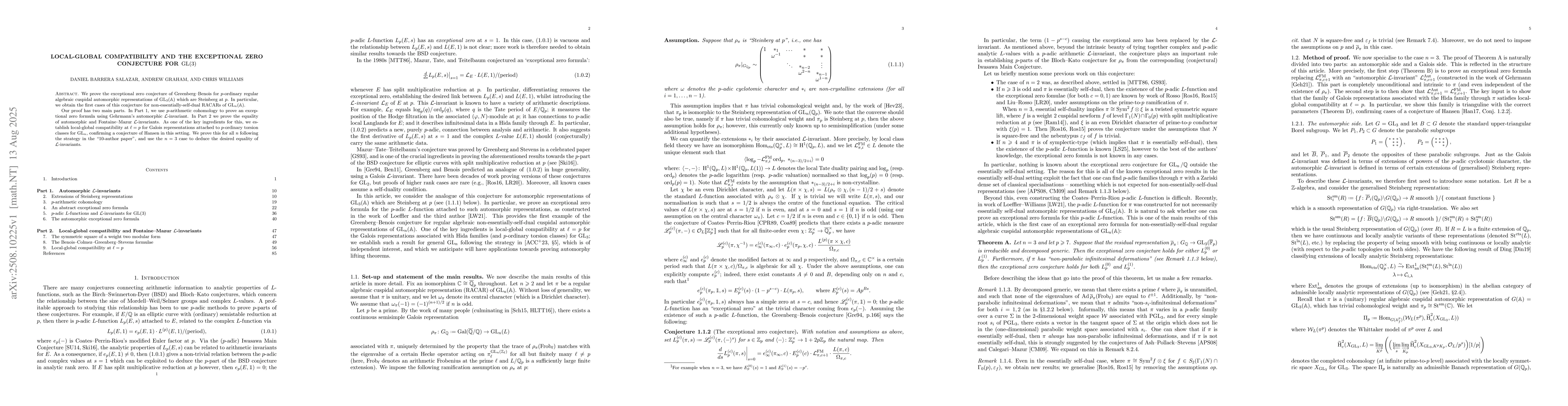 We prove the exceptional zero conjecture of Greenberg--Benois for $p$-ordinary regular algebraic cuspidal automorphic representations of $\mathrm{GL}_3(\mathbb{A})$ which are Steinberg at $p$. In particular, we obtain the first cases of this conjecture for non-essentially-self-dual RACARs of $\mathrm{GL}_n(\mathbb{A})$. Our proof has two main parts. In Part 1, we use $p$-arithmetic cohomology to prove an exceptional zero formula using Gehrmann's automorphic $\mathcal{L}$-invariant. In Part 2 we prove the equality of automorphic and Fontaine--Mazur $\mathcal{L}$-invariants. As one of the key ingredients for this, we establish local-global compatibility at $\ell = p$ for Galois representations attached to $p$-ordinary torsion classes for $\mathrm{GL}_n$, confirming a conjecture of Hansen in this setting. We prove this for all $n$ following the strategy in the "10-author paper," and use the $n=3$ case to deduce the desired equality of $\mathcal{L}$-invariants.