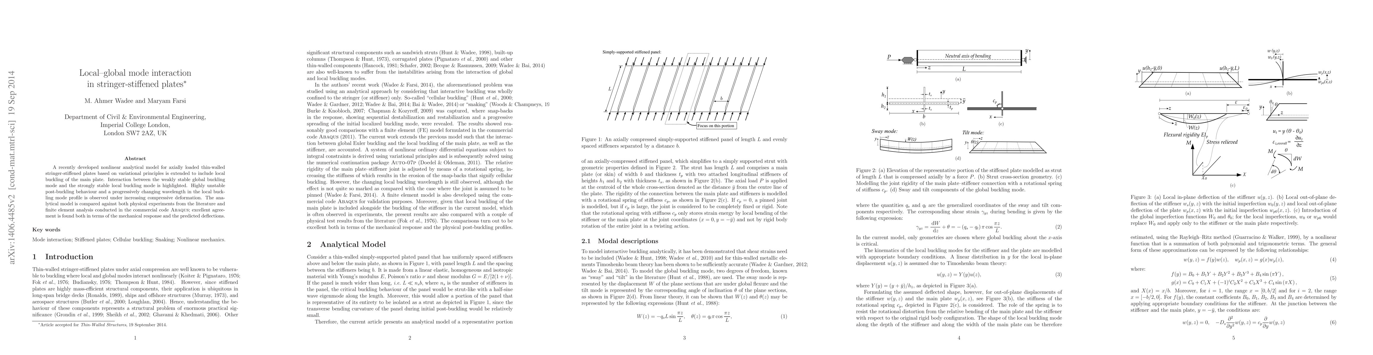 This research extends a nonlinear analytical model for axially loaded stringer-stiffened plates to include local buckling, highlighting the interaction between global and local buckling modes. The study observes complex post-buckling behavior and changing local buckling wavelengths, with model predictions aligning well with experimental and finite element data.