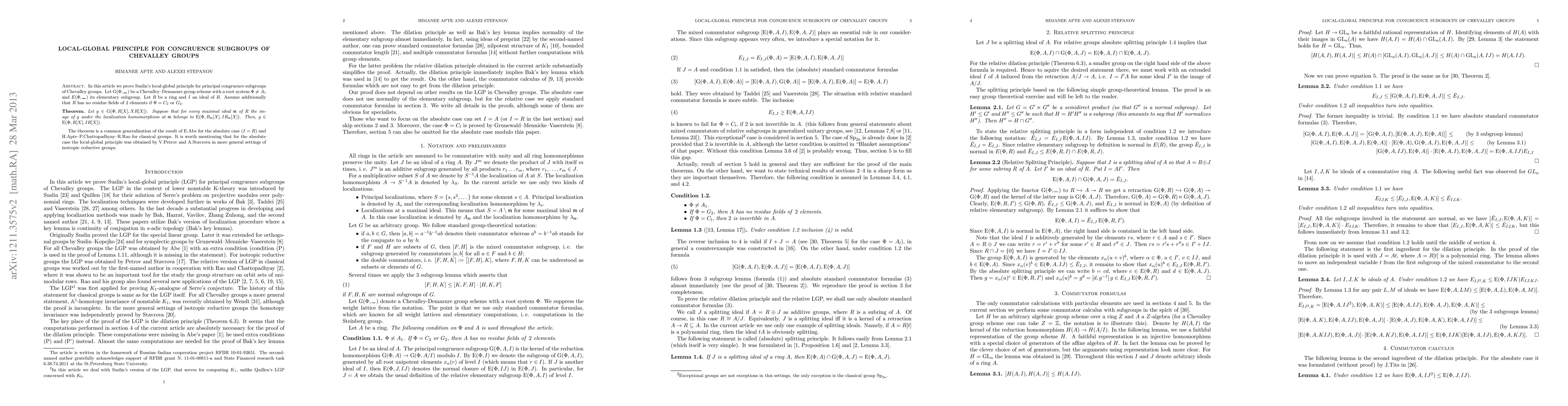 This paper proves Suslin's local-global principle for principal congruence subgroups of Chevalley groups, showing that if an element of a Chevalley group over a ring satisfies the principle locally at every maximal ideal, it must belong to the elementary subgroup globally. This generalizes previous results for both the absolute case and classical groups.