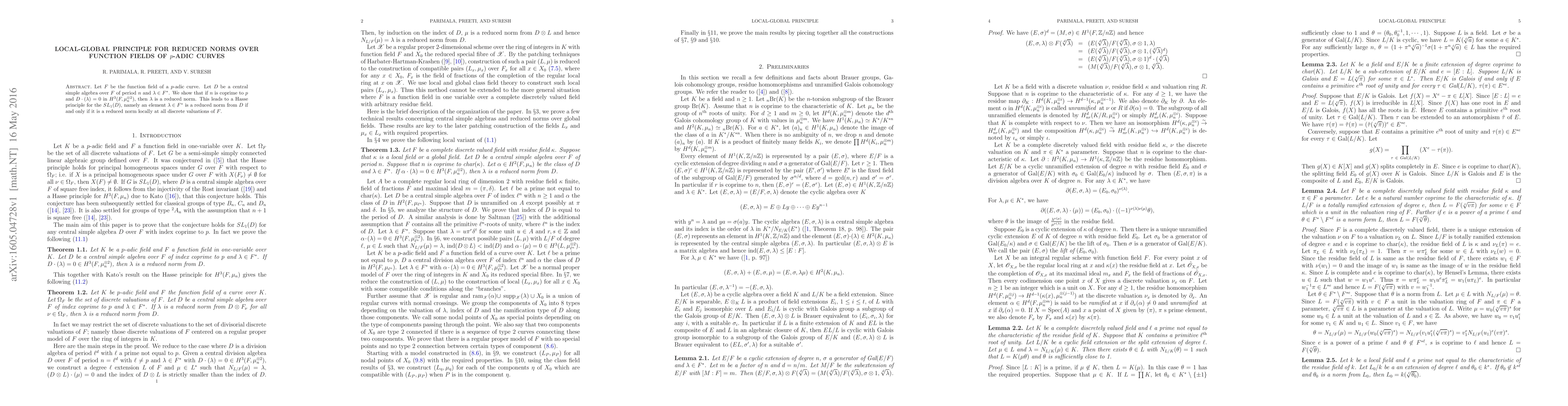 This paper proves that the Suslin invariant can determine if an element in a function field over a p-adic field is a reduced norm, establishing a local-global principle for reduced norms concerning all discrete valuations of the function field.