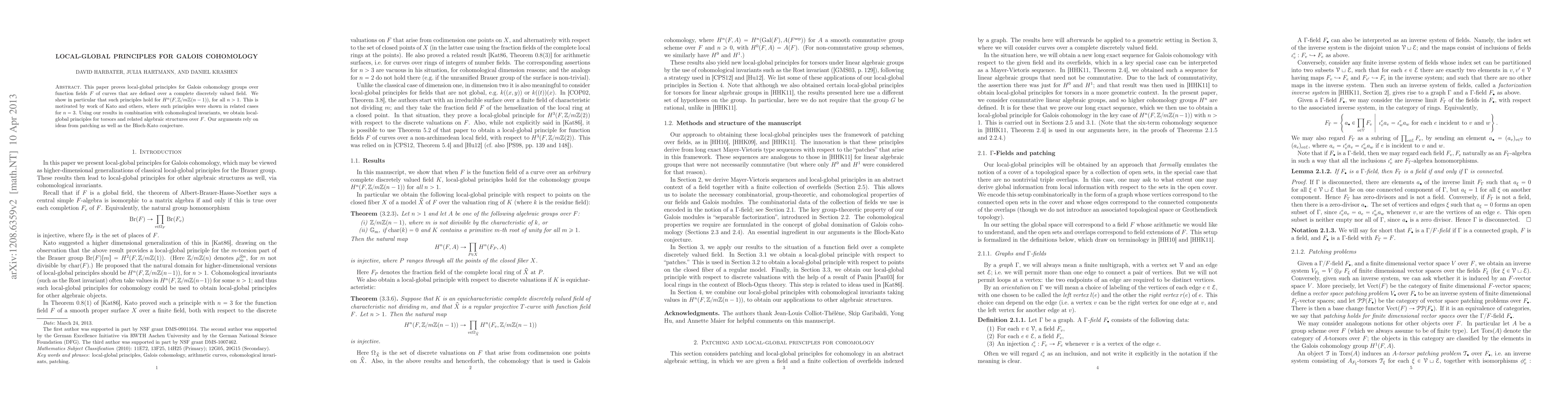 This paper establishes local-global principles for Galois cohomology groups over function fields of curves defined over complete discretely valued fields, particularly for $H^n(F, Z/mZ(n-1))$ when $n > 1$. The findings build on Kato's work and extend local-global principles to torsors and related algebraic structures using patching ideas and the Bloch-Kato conjecture.
